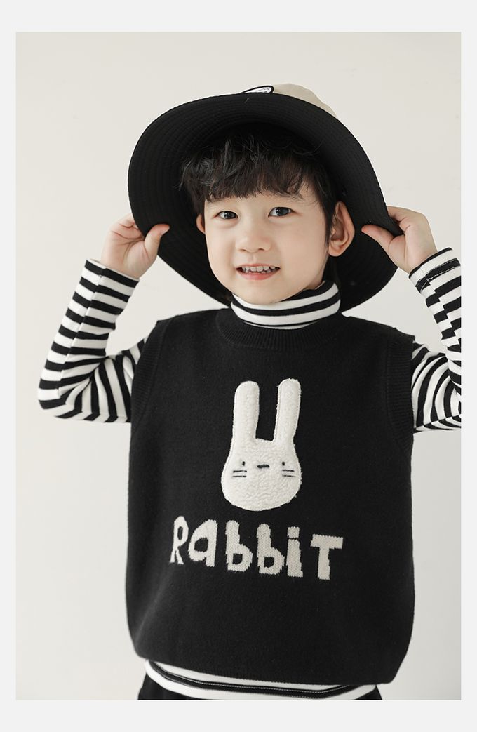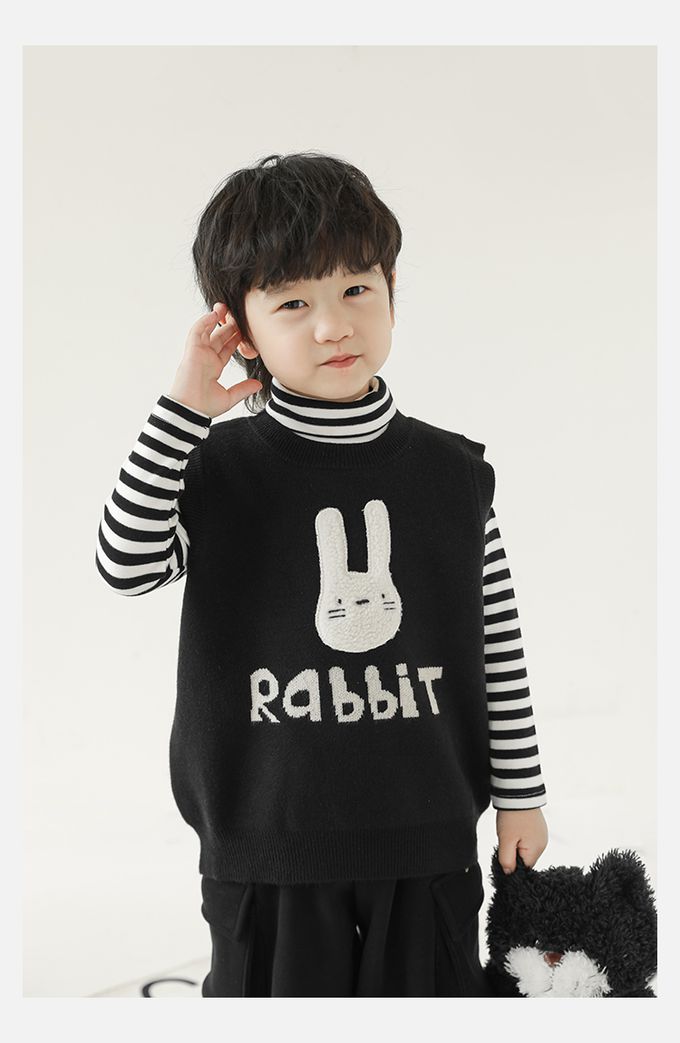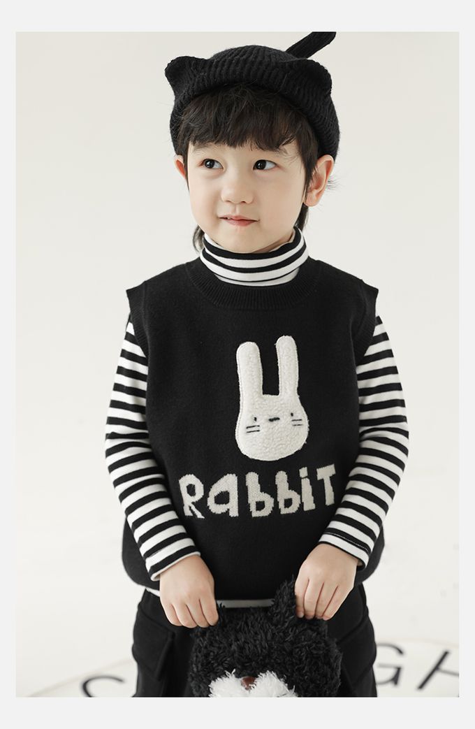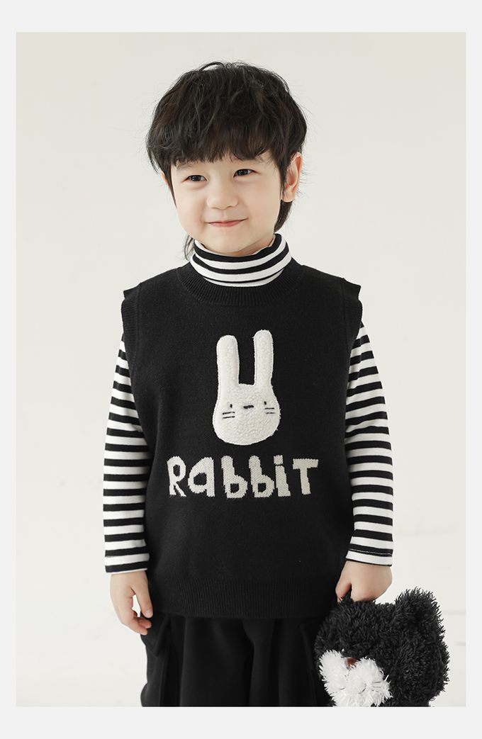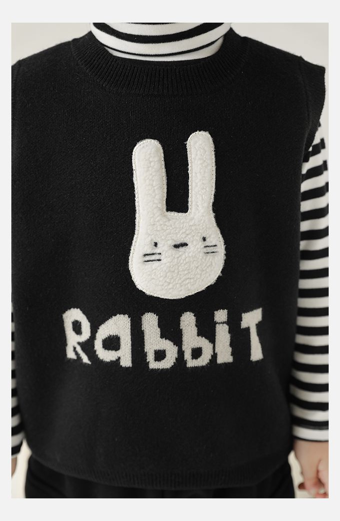 抗起球圓領針織背心-立體毛絨兔子-黑色