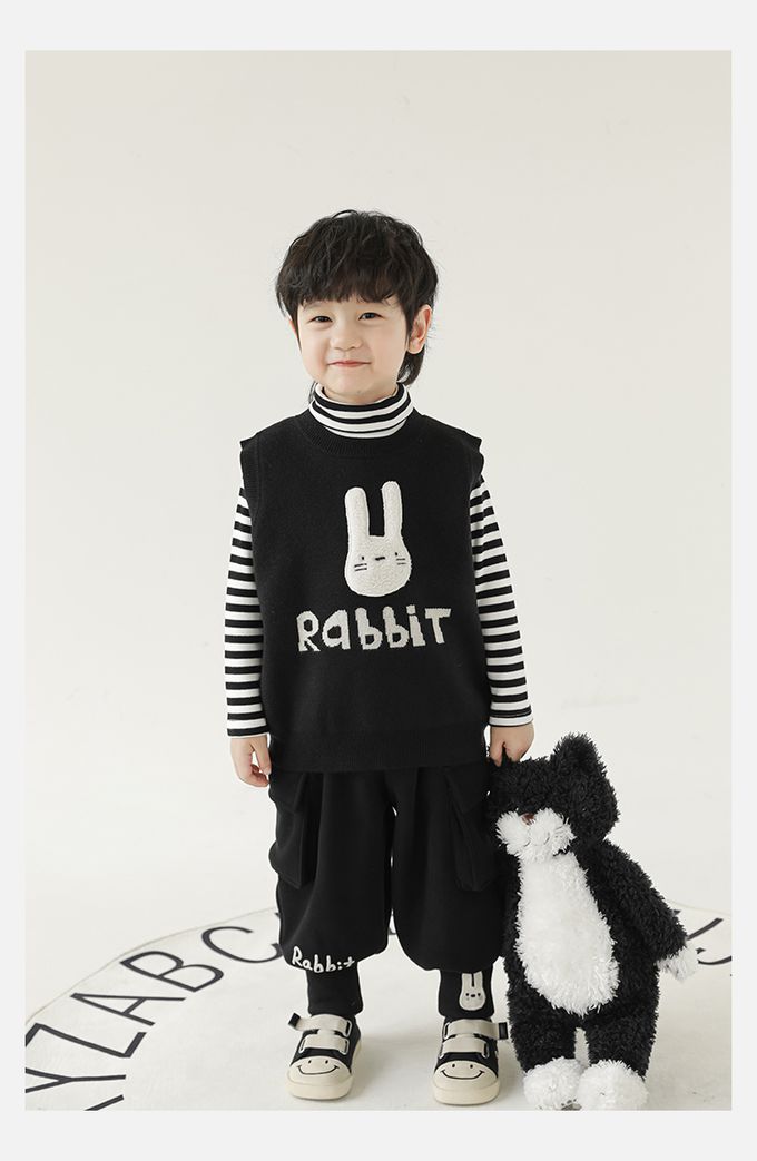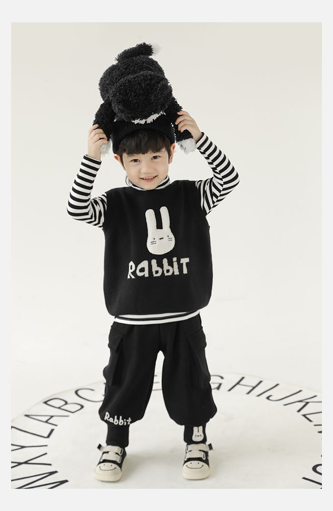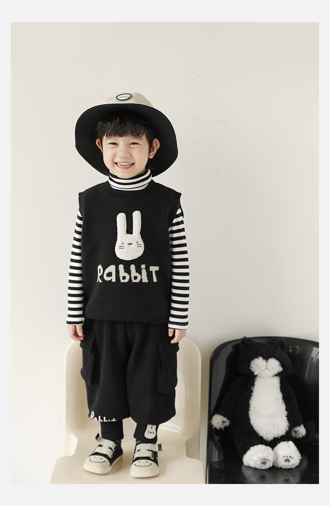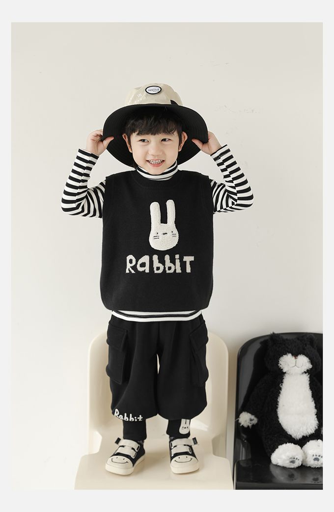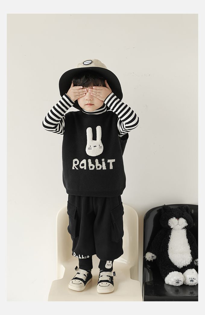 抗起球圓領針織背心-立體毛絨兔子-黑色