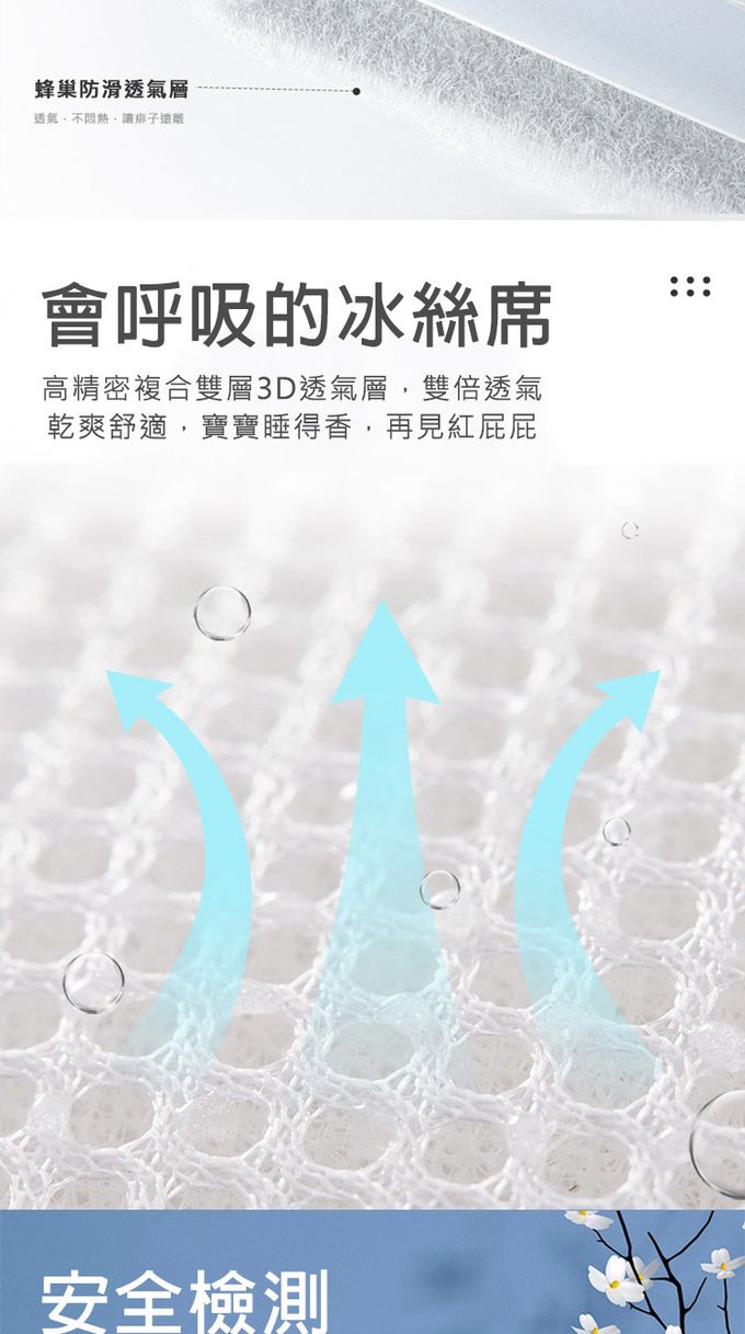 3.四層設計:冰絲纖維層/3D緩衝層/TPU防水層/蜂巢防滑透氣層,給寶寶舒適體驗。