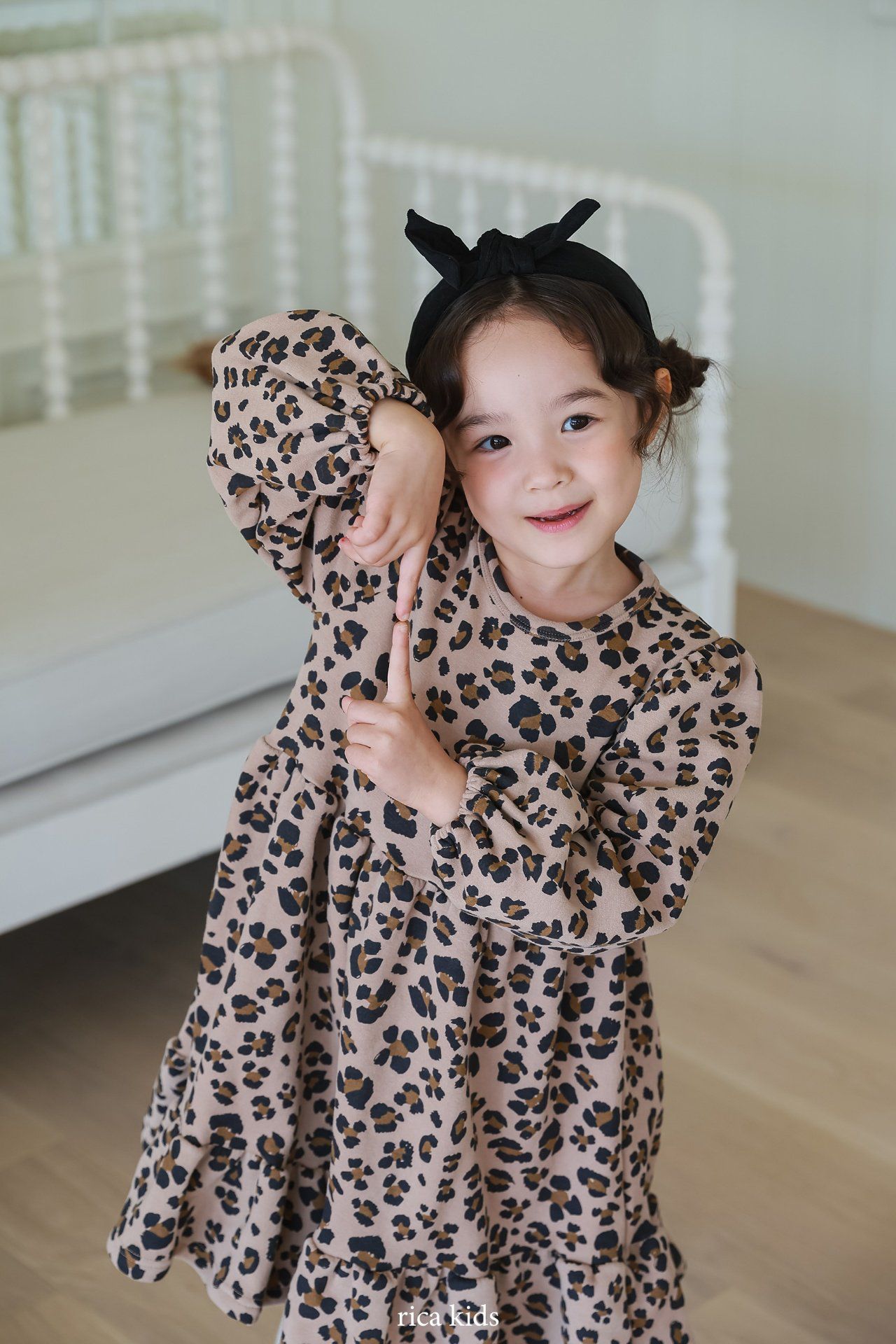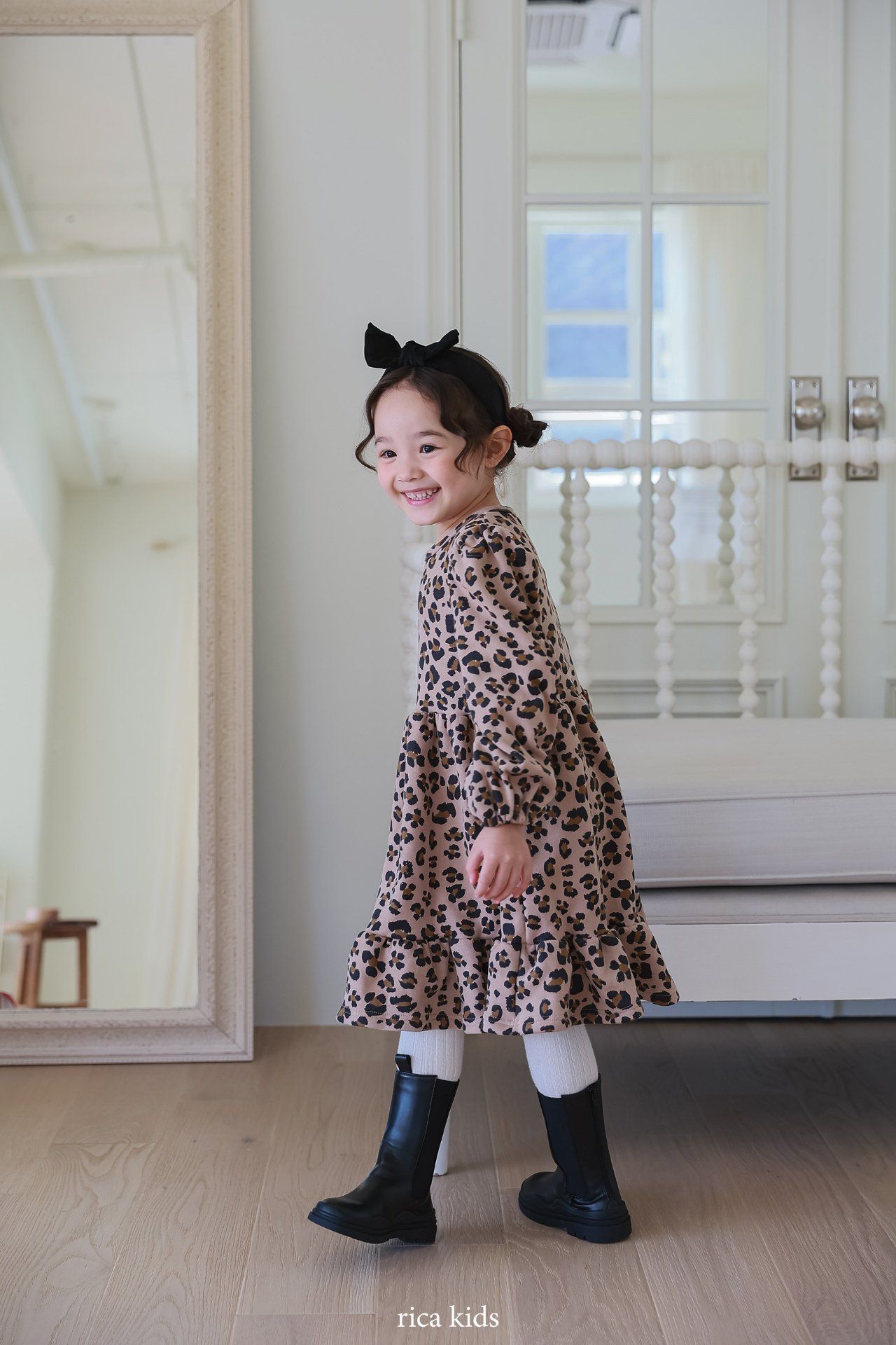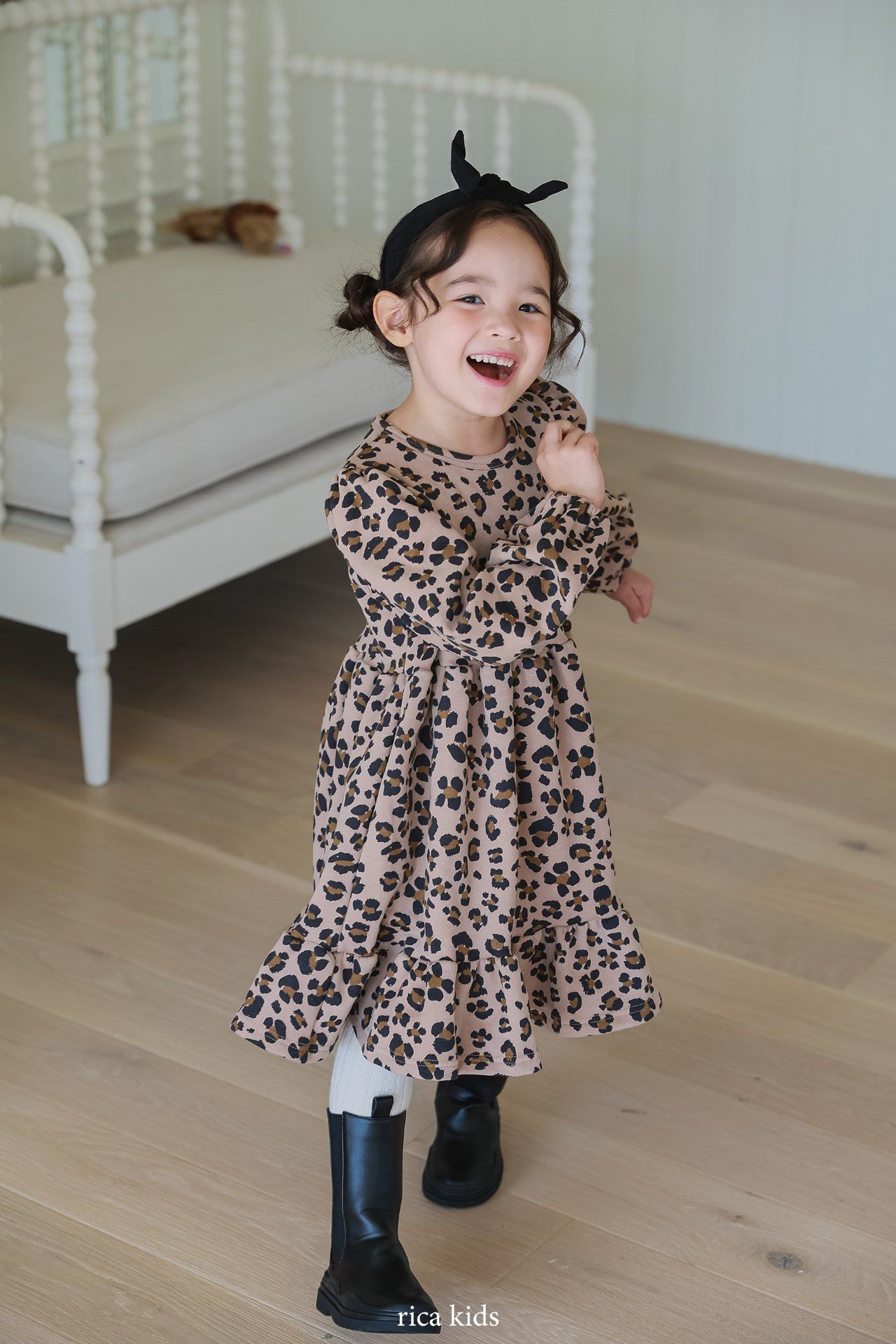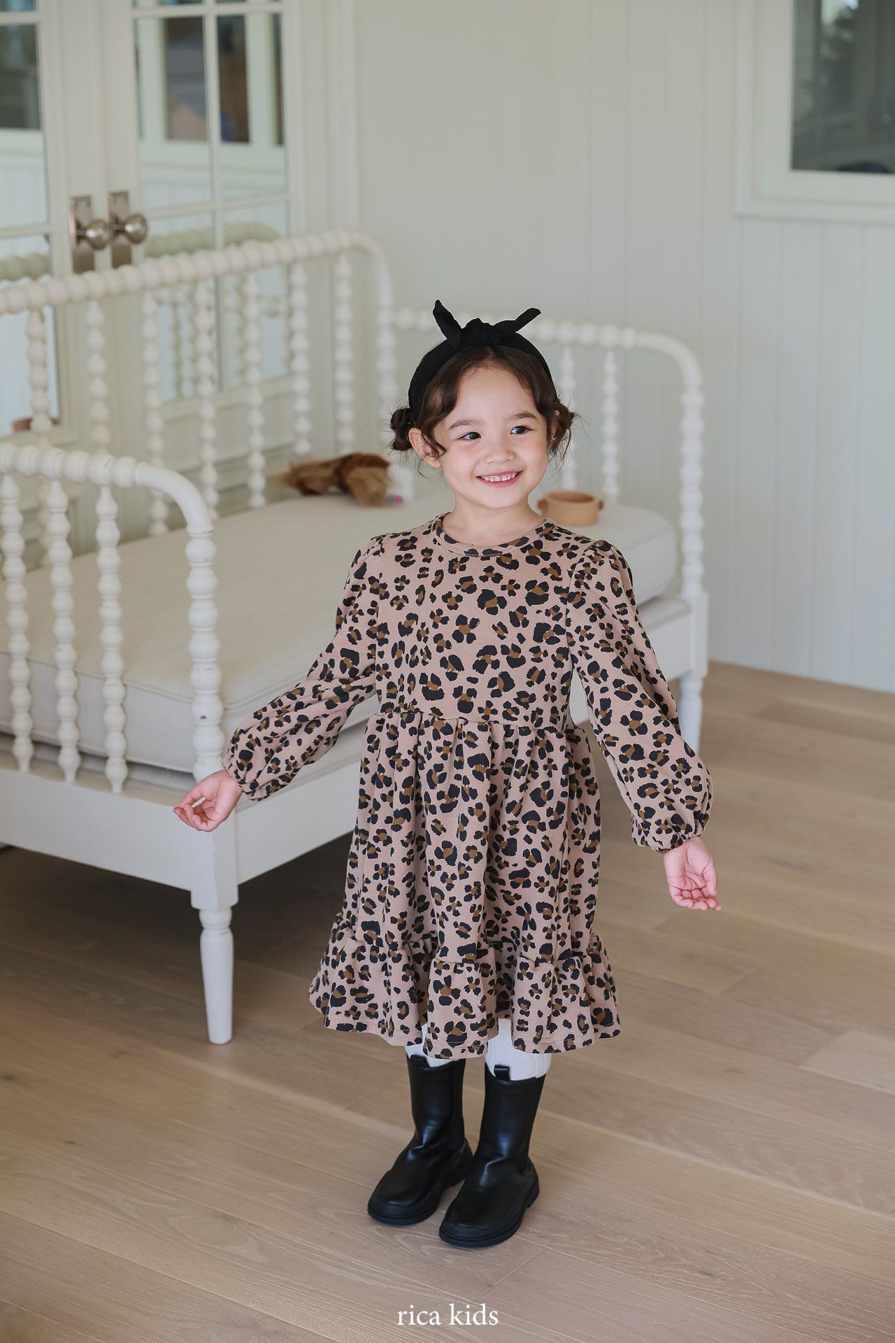 韓國 Rica kids - 復古豹紋印花公主袖拼接洋裝