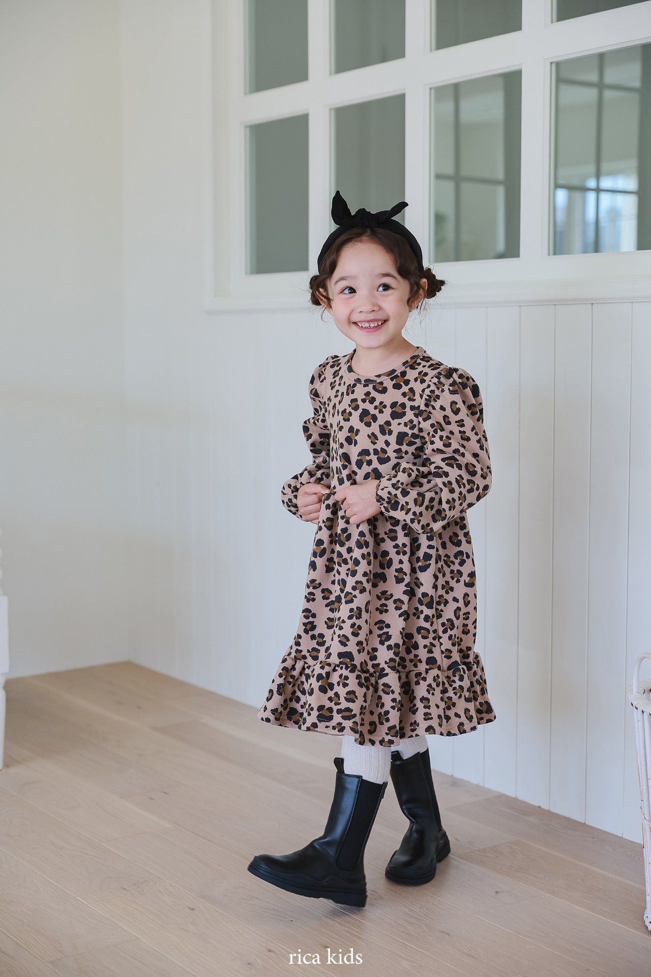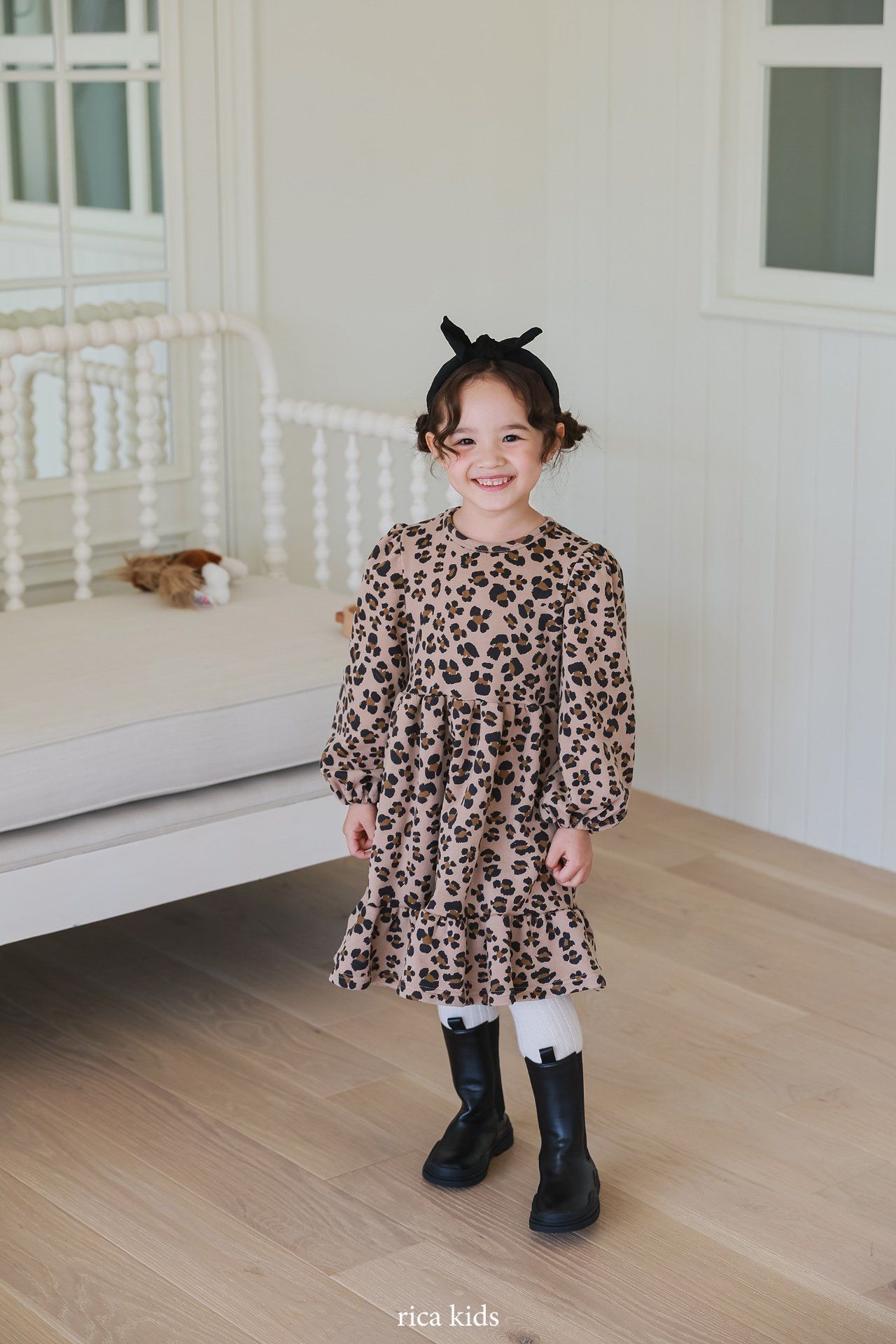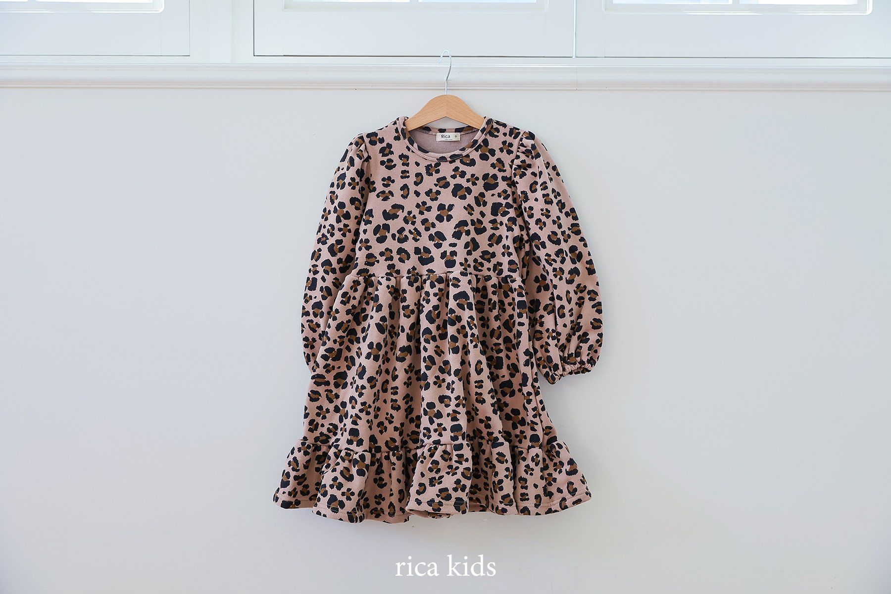 韓國 Rica kids - 復古豹紋印花公主袖拼接洋裝-卡其