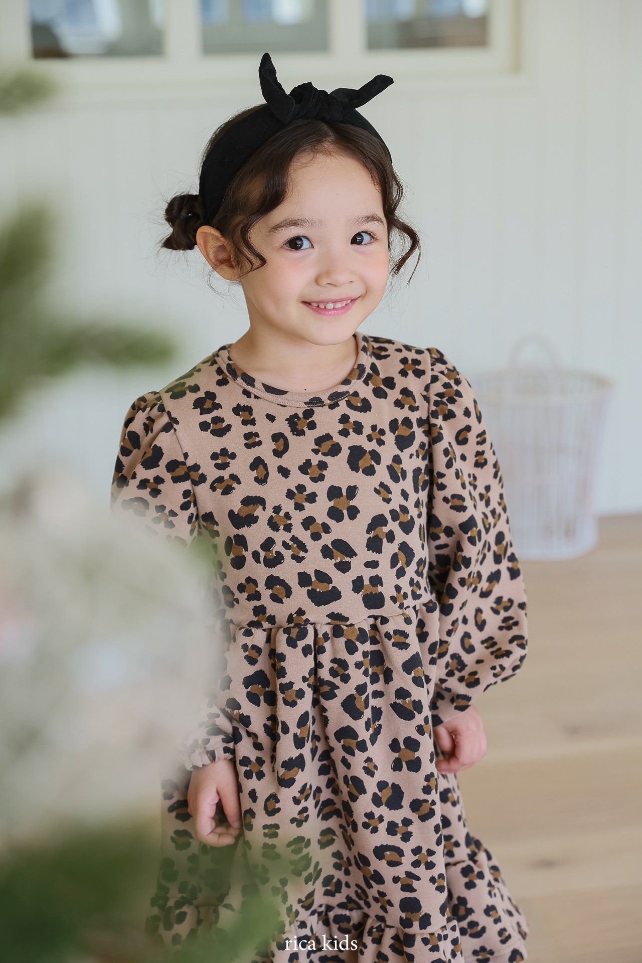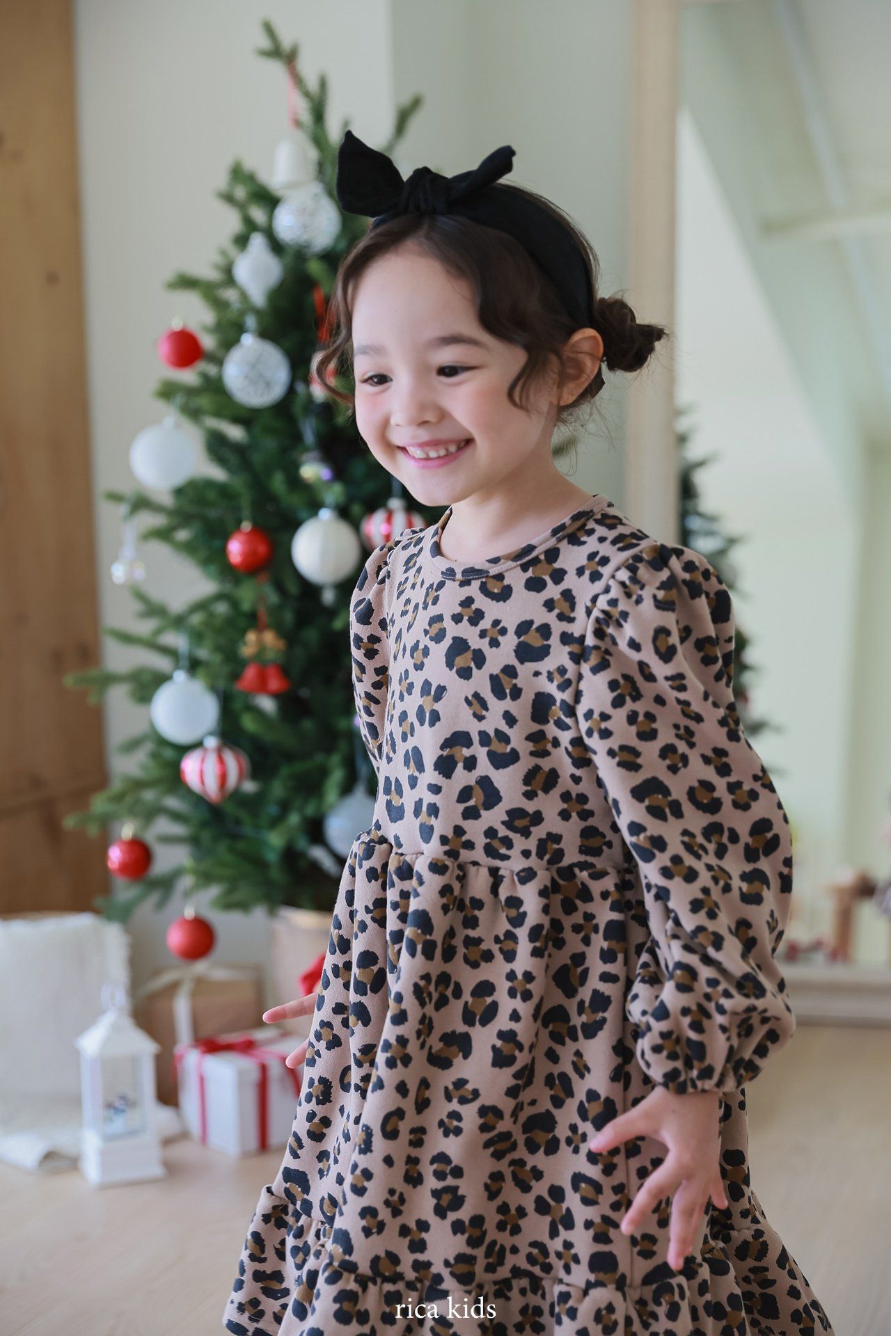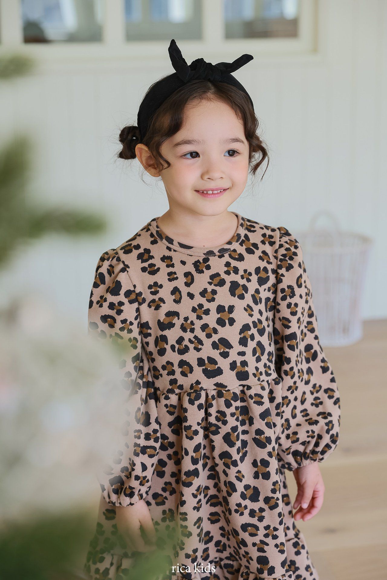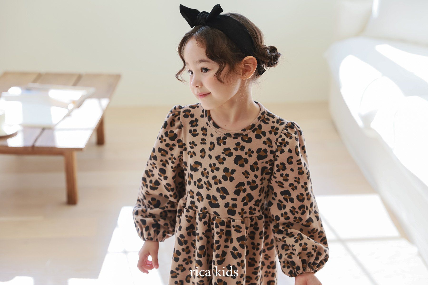 韓國 Rica kids - 復古豹紋印花公主袖拼接洋裝-卡其