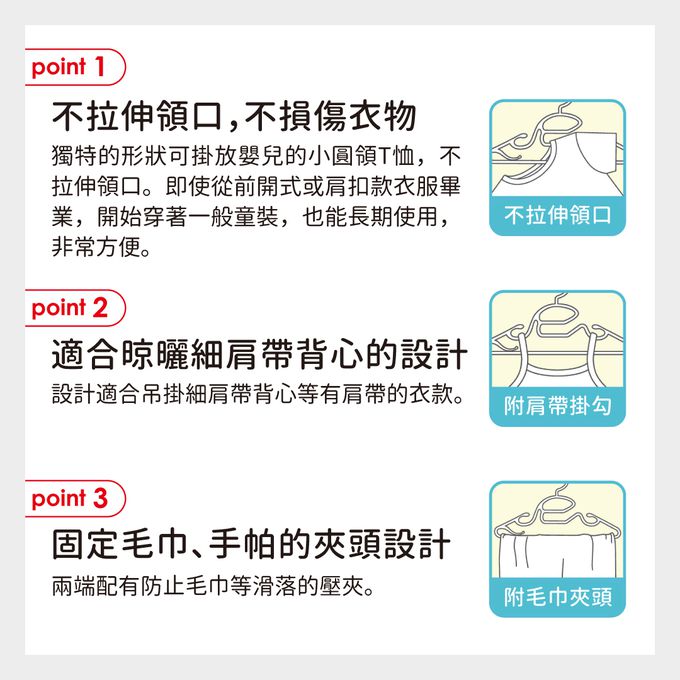 採用了可輕鬆穿過領口的形狀設計,因此在晾曬衣物時,無需拉圓領的領子或將衣架從底部往上穿。
