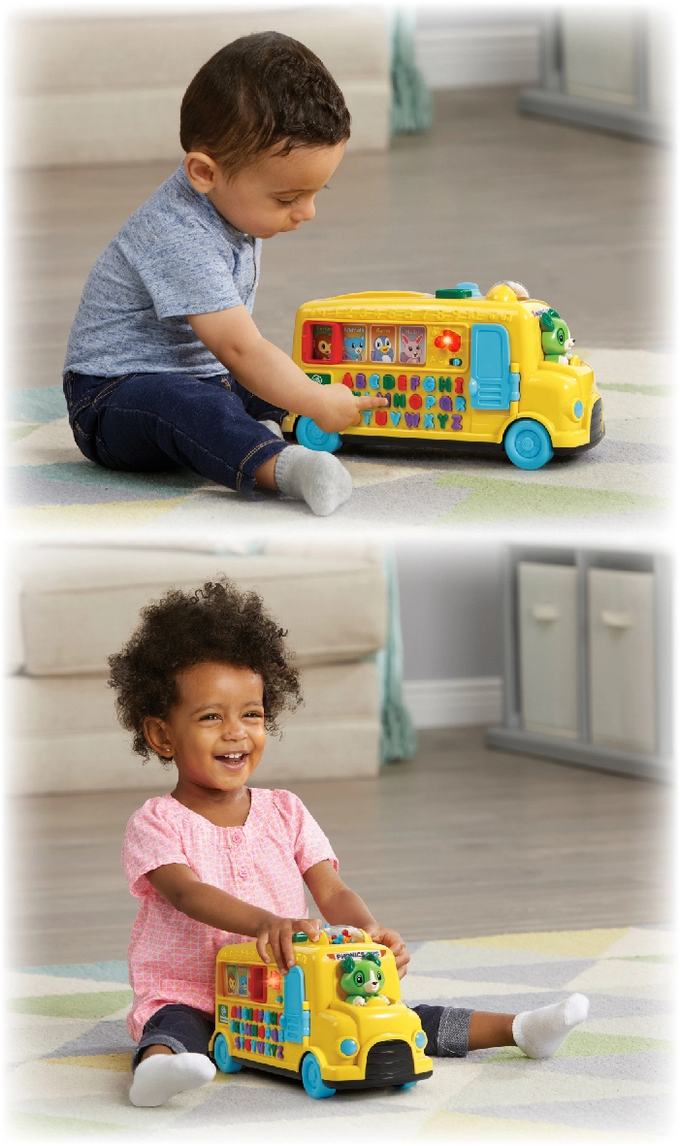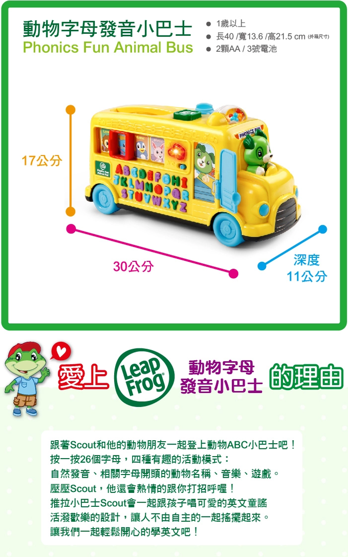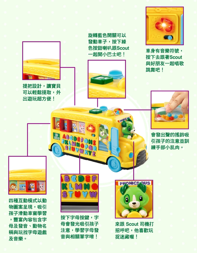 車上有 26 個字母按鍵,搭配窗戶上四種動物,一共是四種有趣的活動模式:自然發音、相關字母開頭的動物名稱、音樂、遊戲