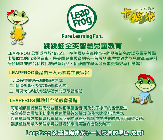 編媽小時候英文聽力並不好(這應該是台灣孩子的共同難處吧?因為學校只考閱讀啊!),Leapfrog玩具都是「道地的英語發音」,透過遊戲中的英語互動,讓孩子從「多聽」變成「敢說」!