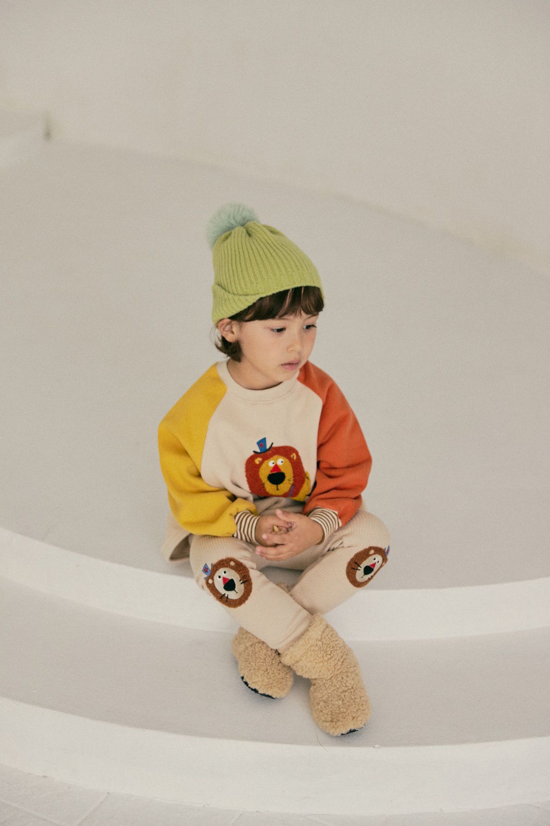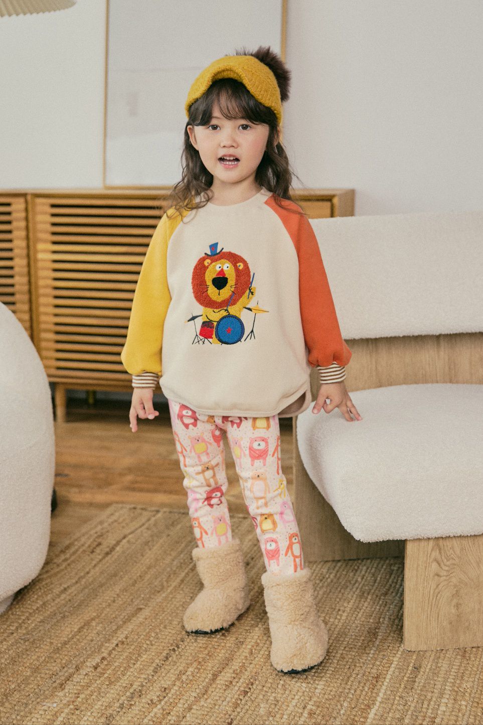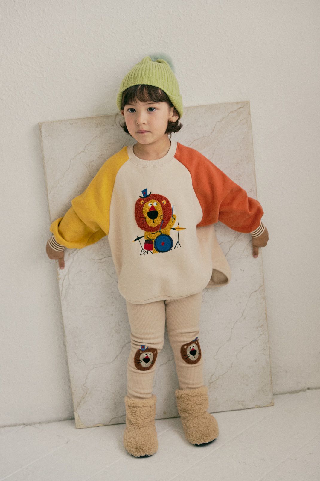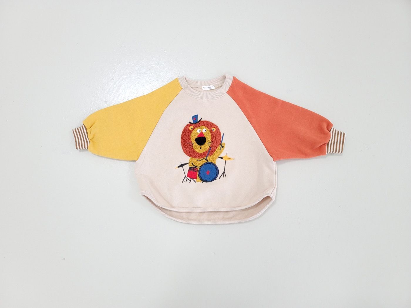 韓國 Mimico - (內磨毛)毛絨裝飾長袖上衣-獅子打鼓-黃X橘