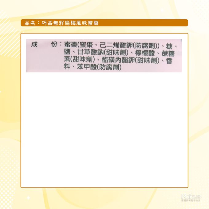 成分:蜜棗(蜜棗、己二烯酸鉀(防腐劑))、糖、鹽、甘草酸鈉(甜味劑)、檸檬酸、蔗糖素(甜味劑)、醋磺內酯鉀(甜味劑)、香料、苯甲酸(防腐劑)