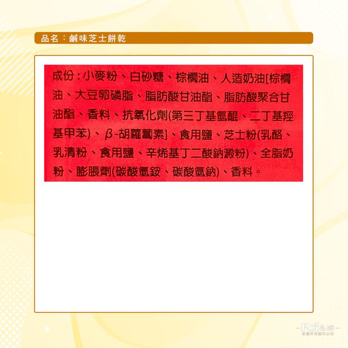 成分:小麥粉、白砂糖、棕櫚油、人造奶油[棕櫚油、大豆卵磷脂、脂肪酸甘油酯、脂肪酸聚合甘油酯、香料、抗氧化劑(第三丁基氫醒、二丁基羥基甲苯)、B-胡糶蔔素]、食用鹽、芝士粉(乳酪、乳清粉、食用鹽、辛烯基丁二酸鈉澱粉)、全脂奶粉、膨脹劑(碳酸氫銨、碳酸氫鈉)、香料
