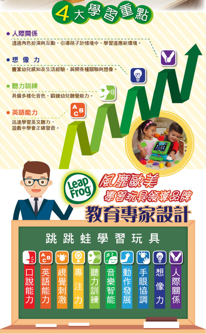 LeapFrog 是美國寶寶學母語首選的教具品牌!是具備專業和趣味於一身的兒童英文學習品牌,在美國電子教學市場有 63% 市佔率!