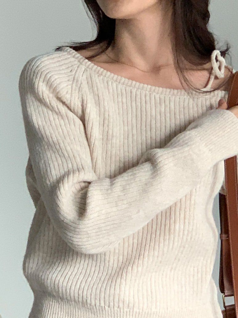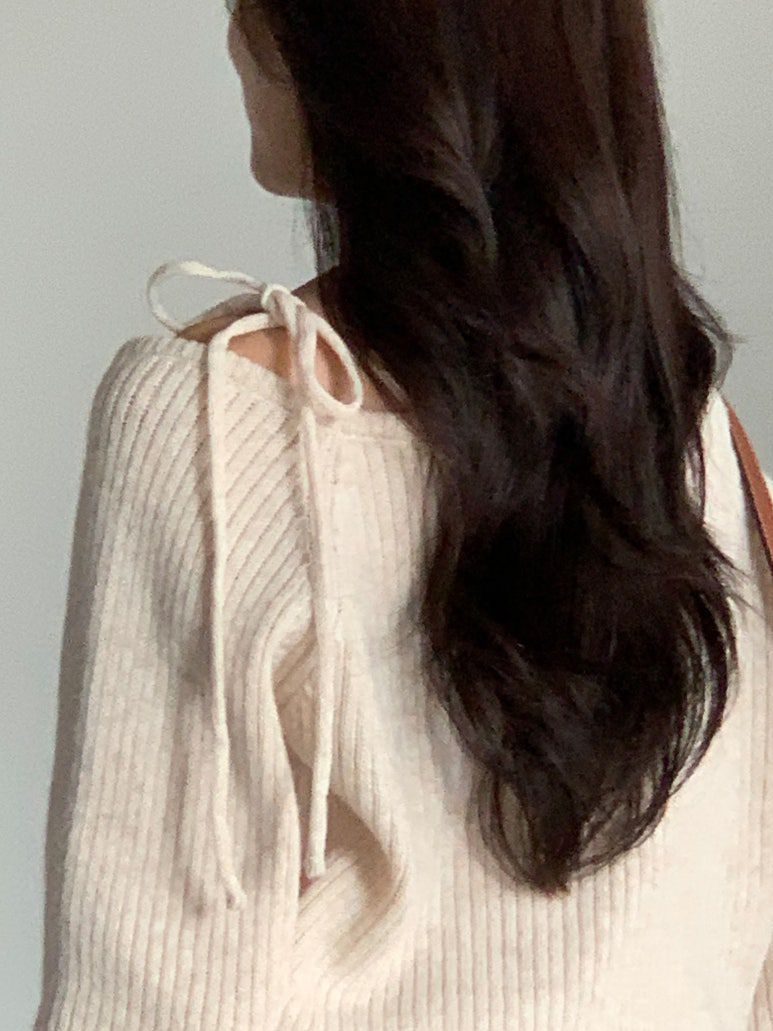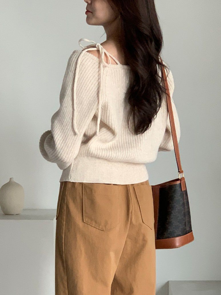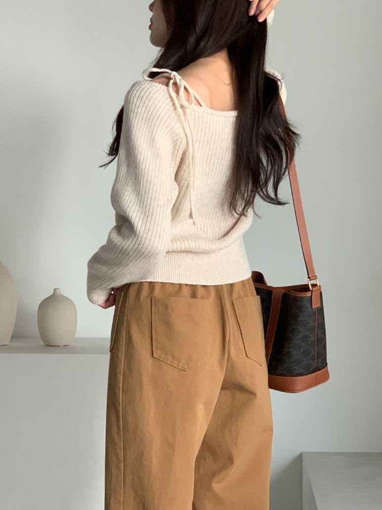 韓國女裝連線 - 甜美打結肩帶針織長袖上衣-燕麥杏 (FREE)