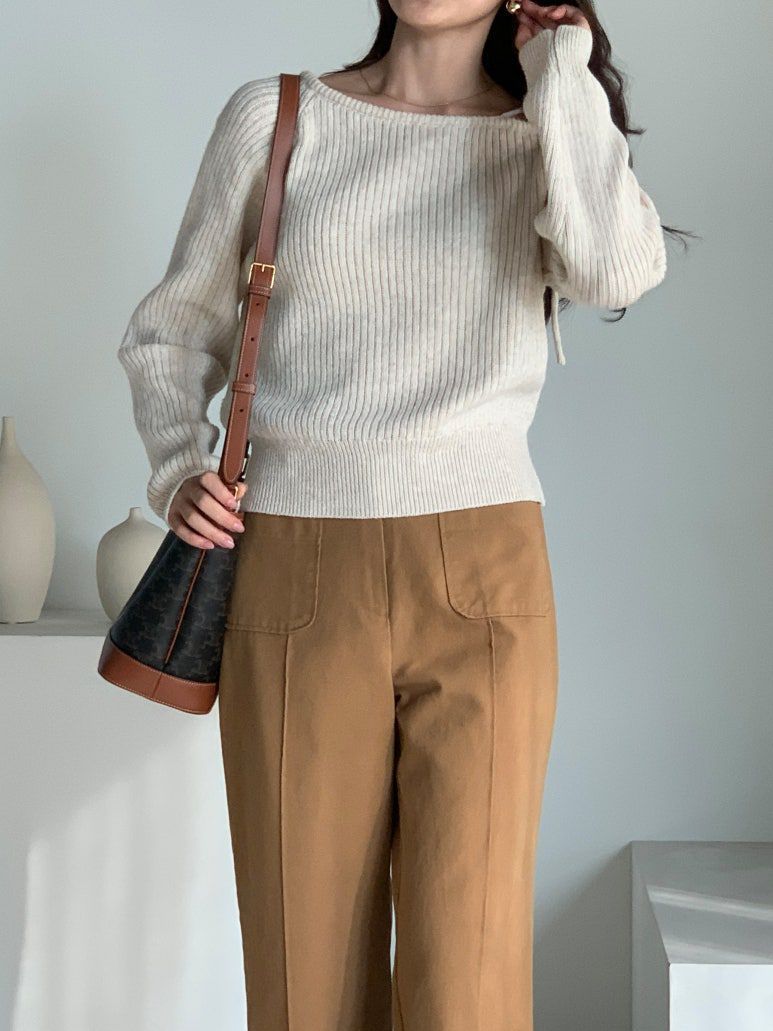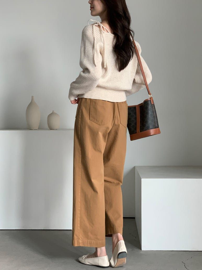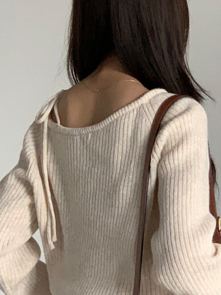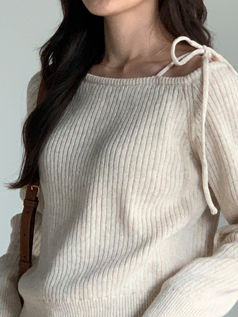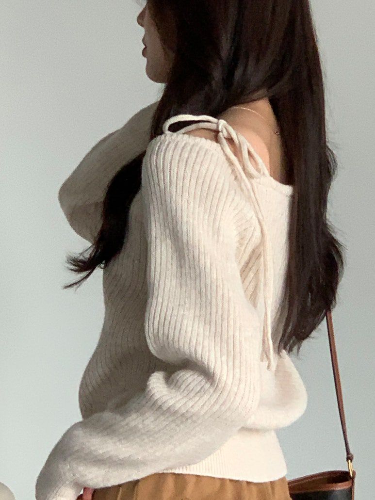 韓國女裝連線 - 甜美打結肩帶針織長袖上衣-燕麥杏 (FREE)