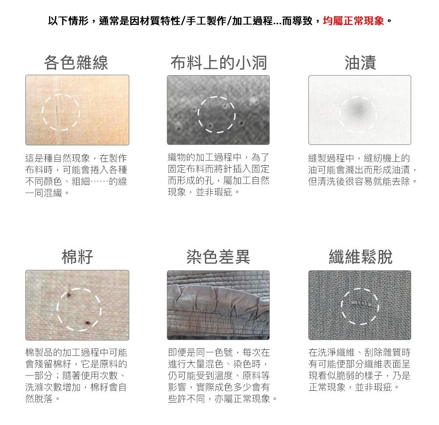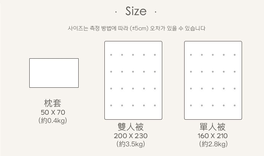 1. 根據測量方式不同,可能存在±5公分左右的誤差。2. 根據拍攝當下光線及每台螢幕顯示器不同,可能存在色差。3. 可機洗。請放入洗衣網後,以冷水單獨柔洗,並使用不含漂白功能的中性洗劑洗滌。4. 請勿放入烘乾機。請勿長時間浸泡。5. 請勿使用染色劑。請勿過量/強力/高溫洗滌。請使用安全正確方式清洗,以延長棉被的可用壽命。