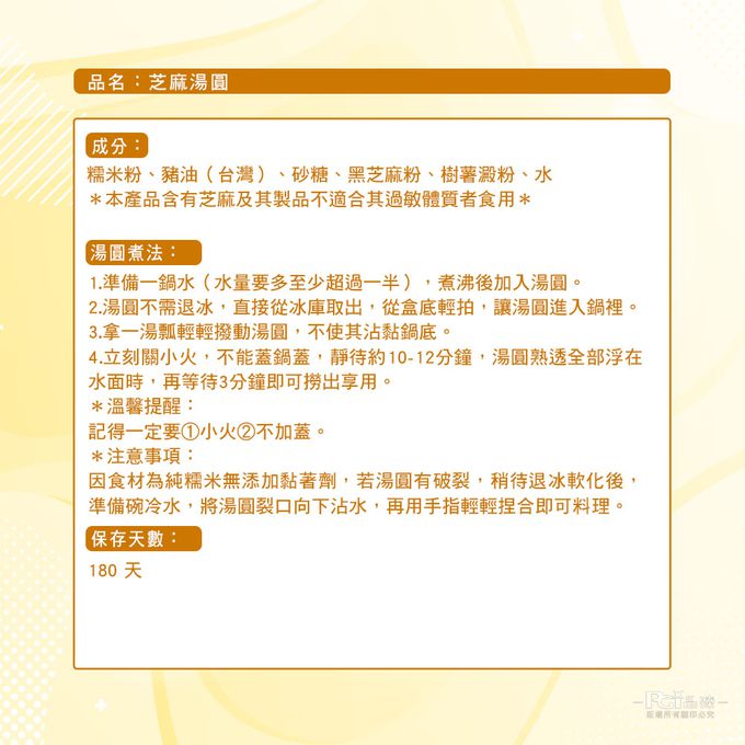 過敏原:芝麻:本產品含有芝麻及其製品,不適合其過敏體質者食用 花生:本產品含有花生及其製品,不適合其過敏體質者食用
