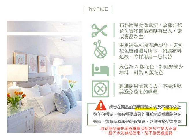 布料因裁切位置的不同,枕頭套、床包、被套部份花版可能會與照片之情竟突有所出入,請以收到的實品為主。(商品顏色僅供參考,色樣會因電腦螢幕設定不同而有誤差,顏色以實際商品為主)