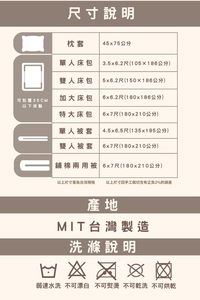 成分:單人二件組:枕套x1、床包x1 雙人三件組:枕套x2、床包x1 雙人加大三件組:枕套x2、床包x1 雙人被套:薄被套x1
