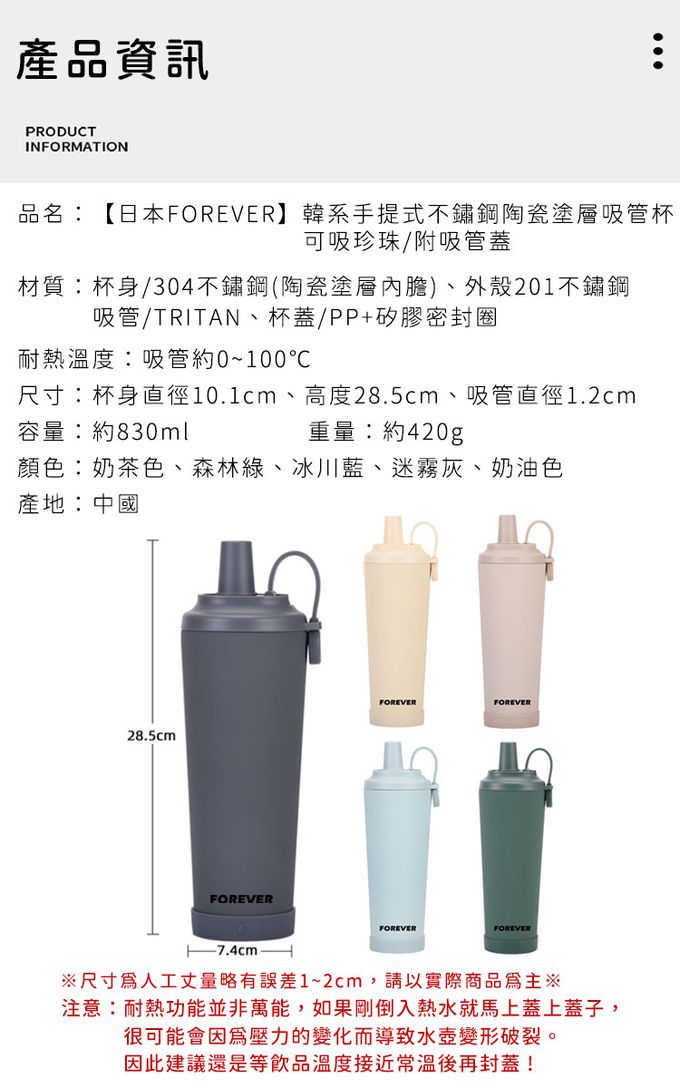 品名:韓系手提式不鏽鋼陶瓷塗層吸管杯/可吸珍珠/附吸管蓋830ml
