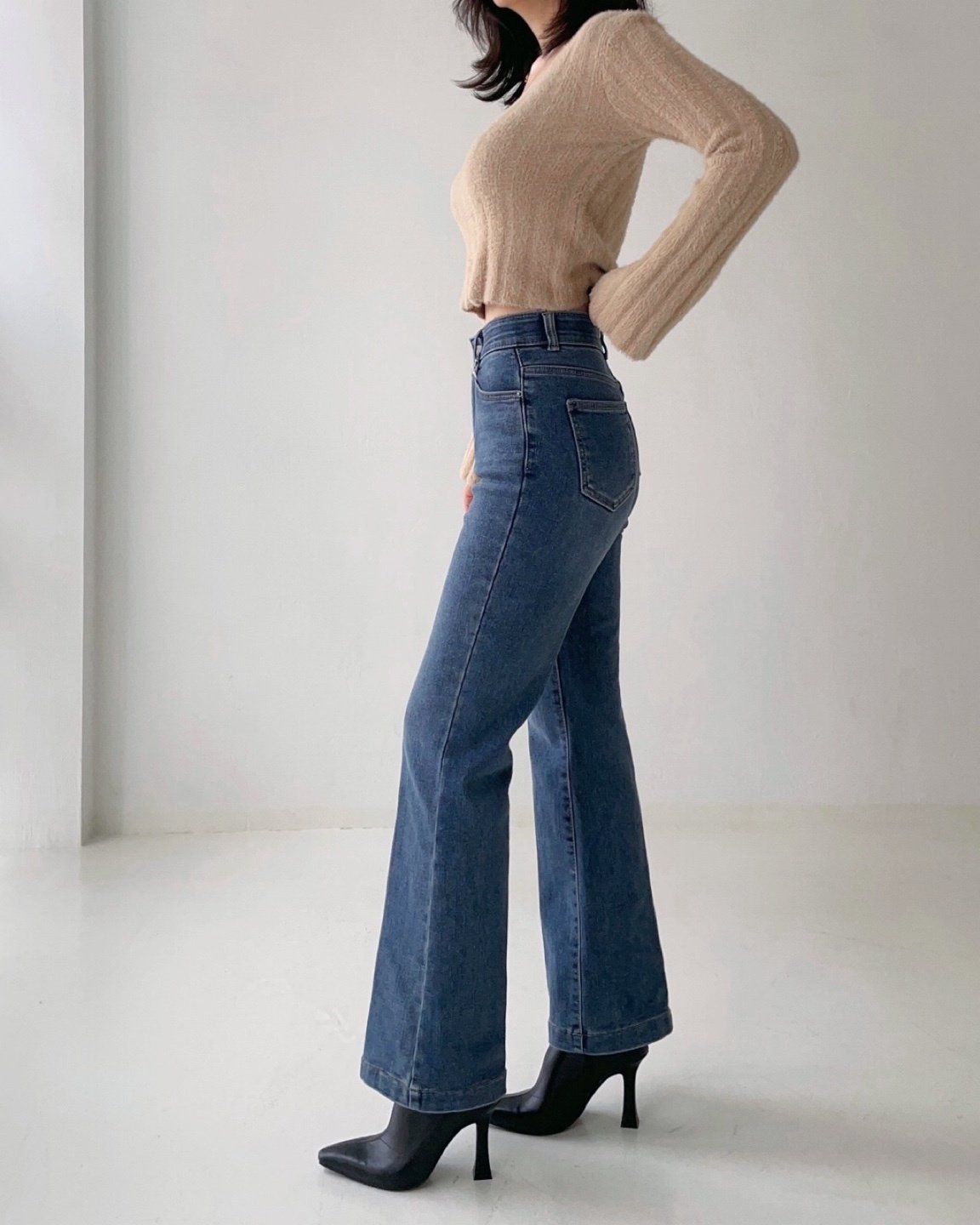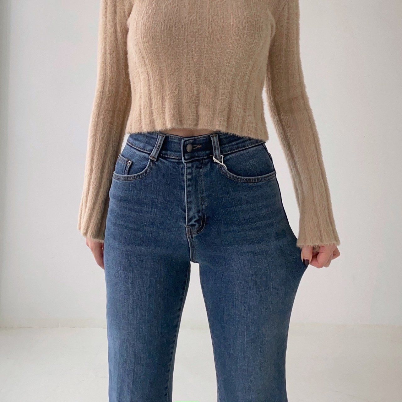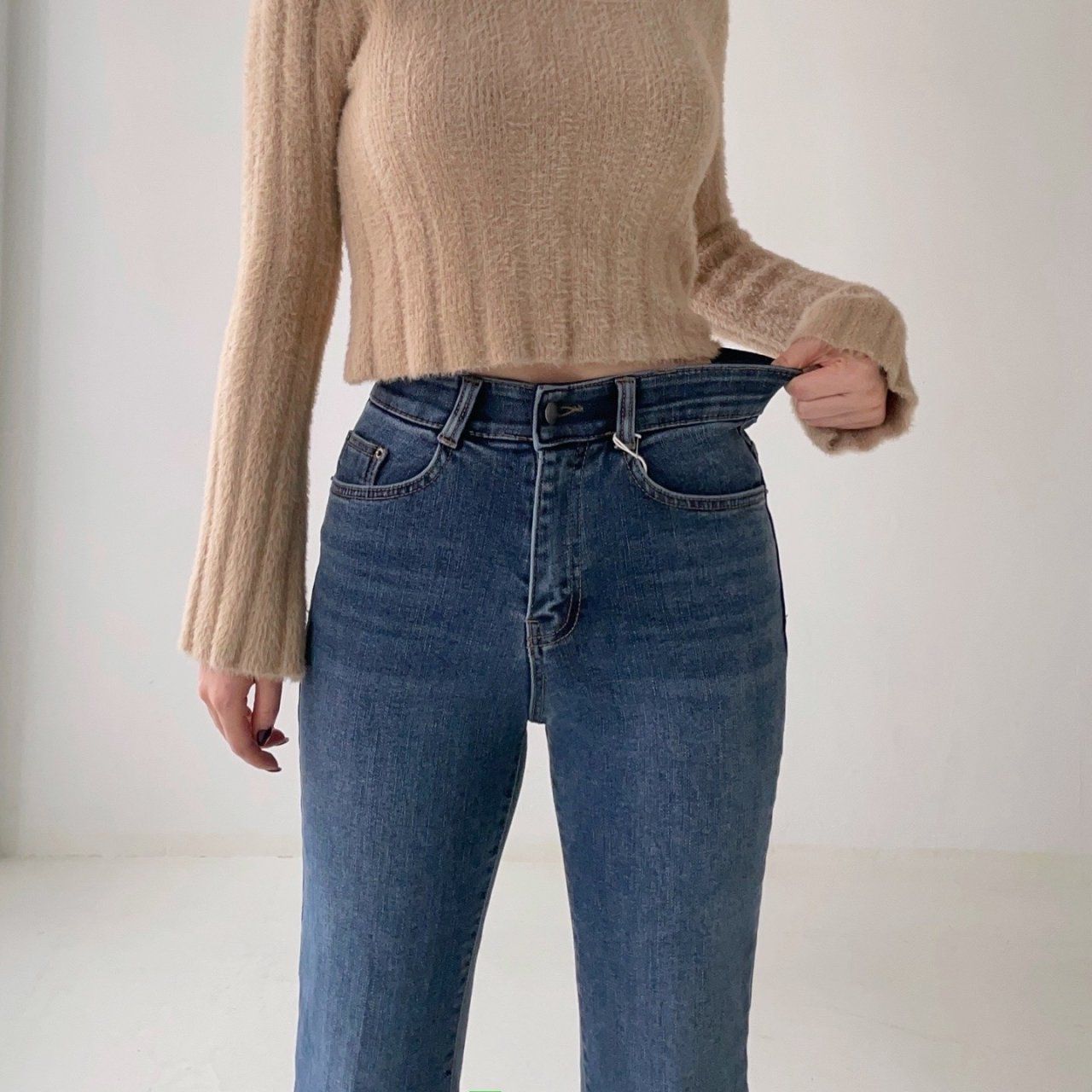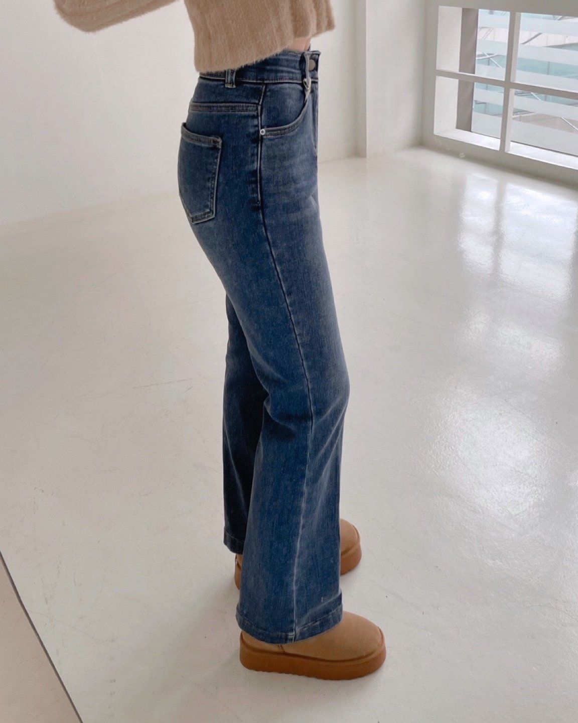 韓國女裝連線 - (內磨毛)彈性腰保暖材質翹臀小喇叭褲-深藍
