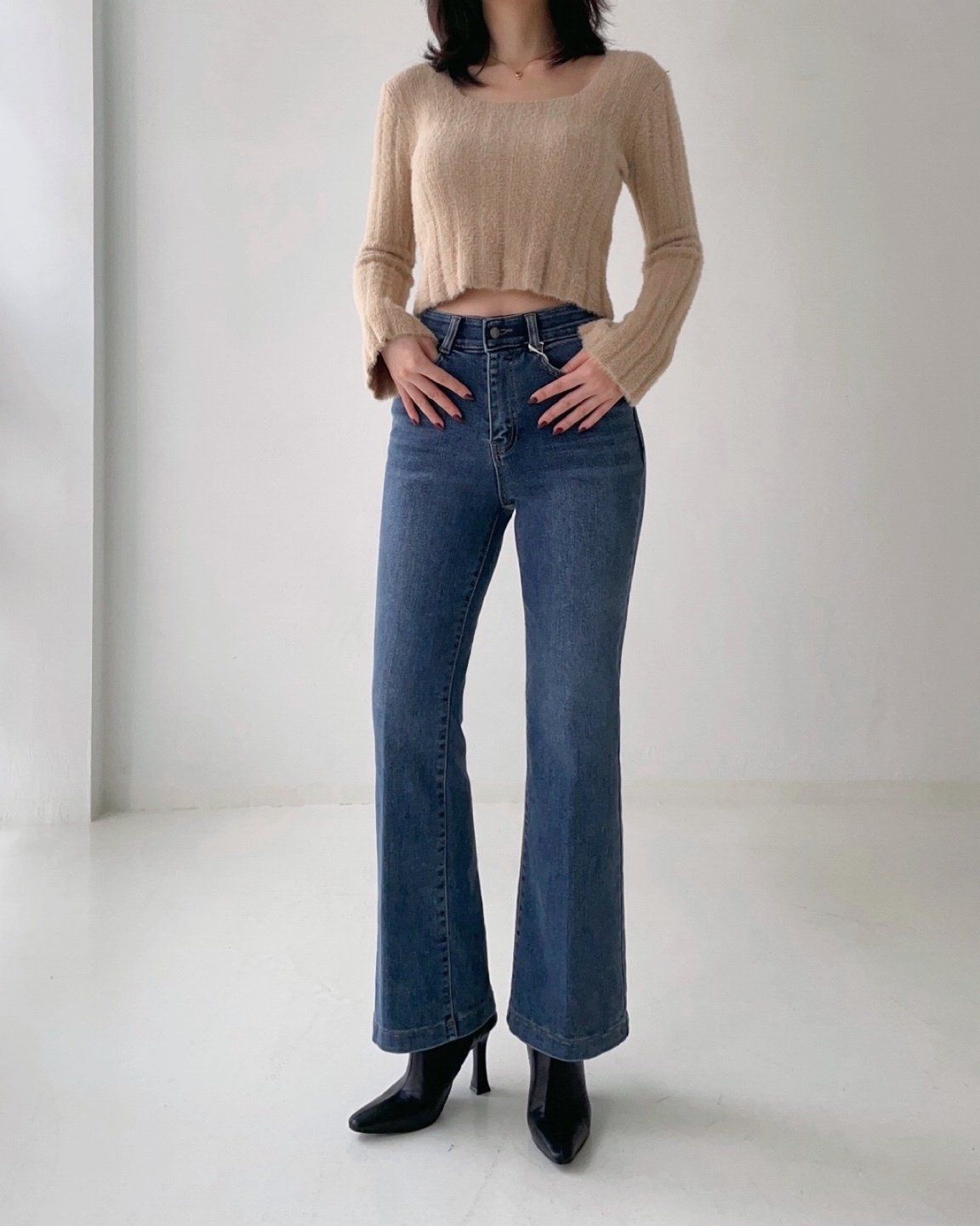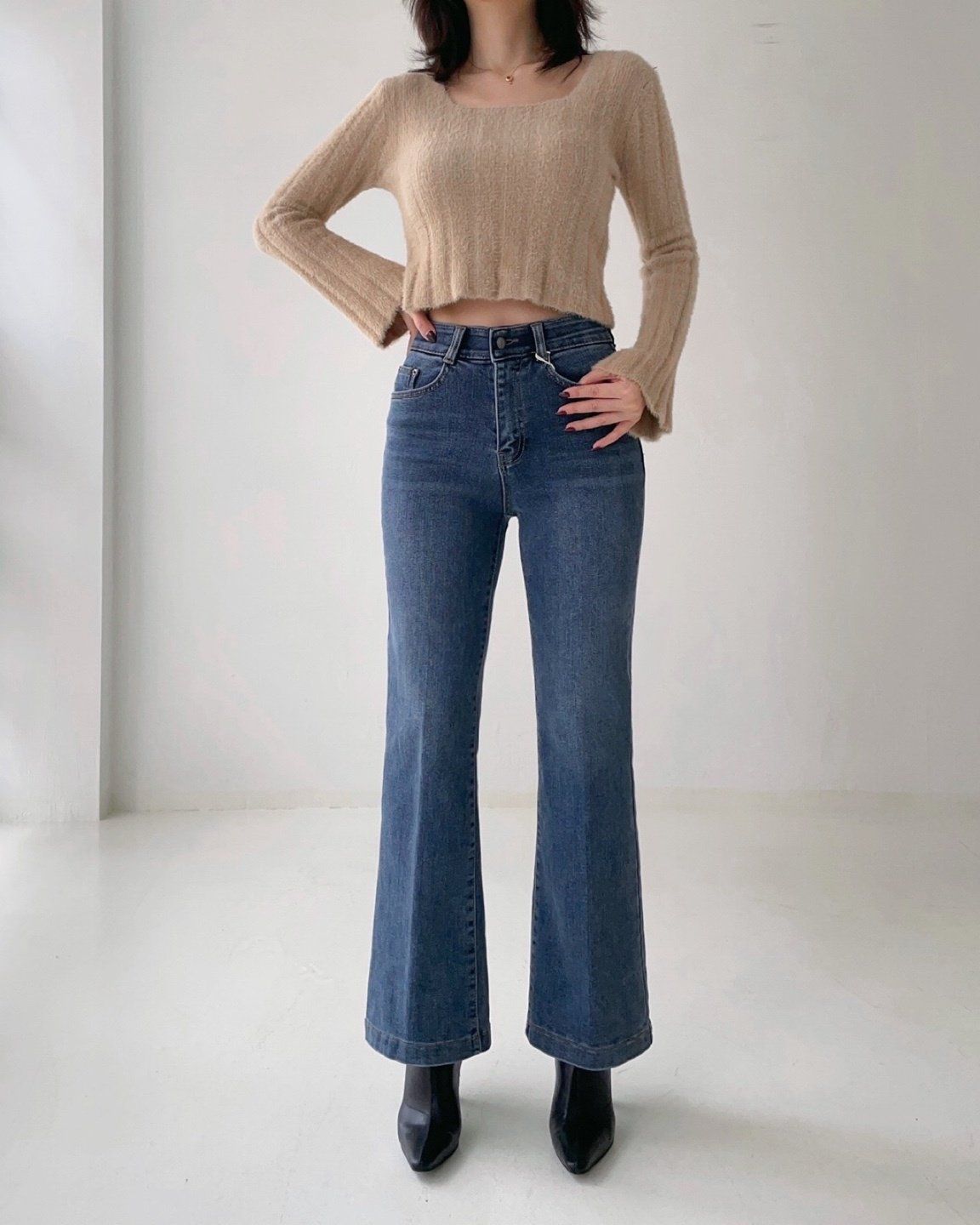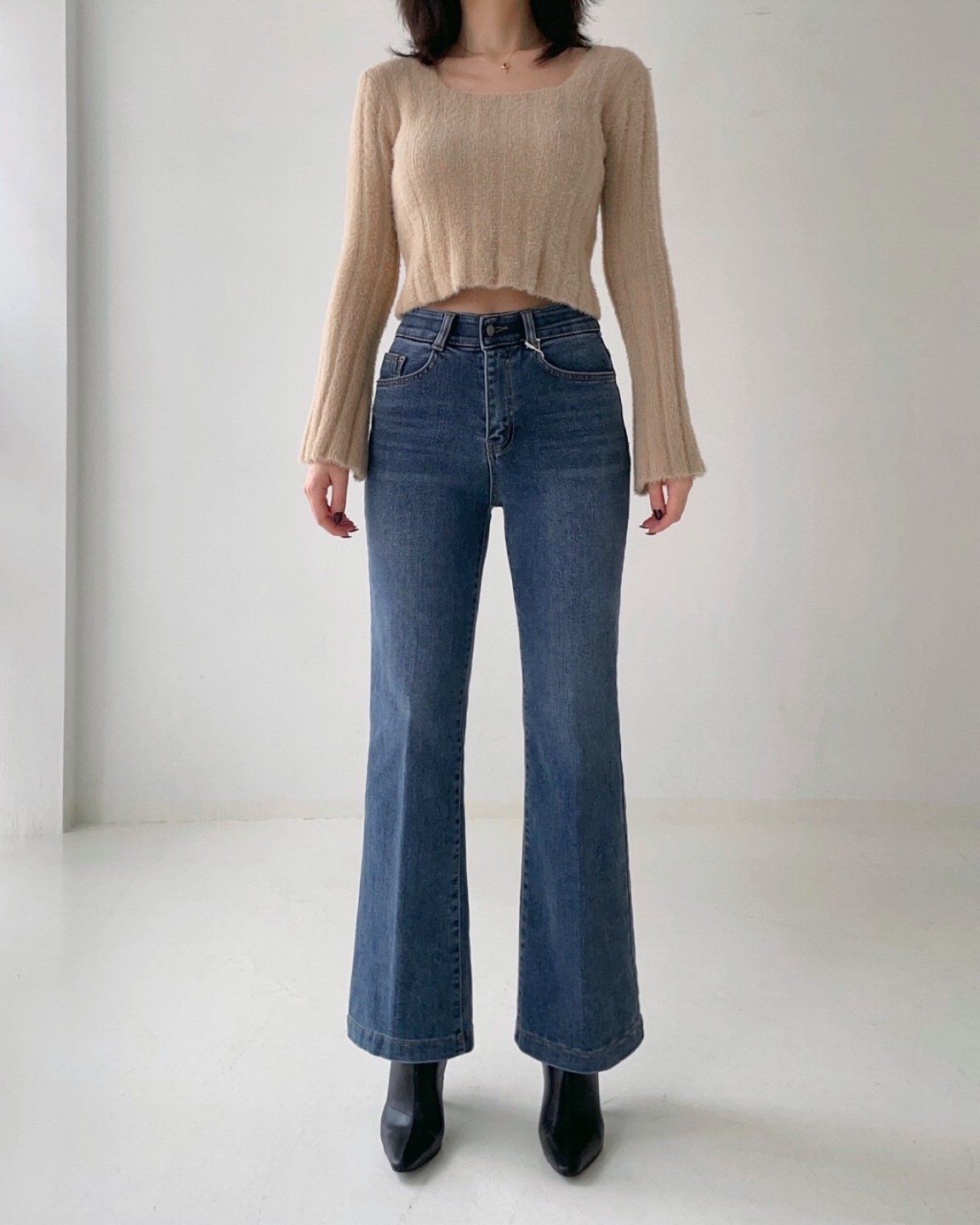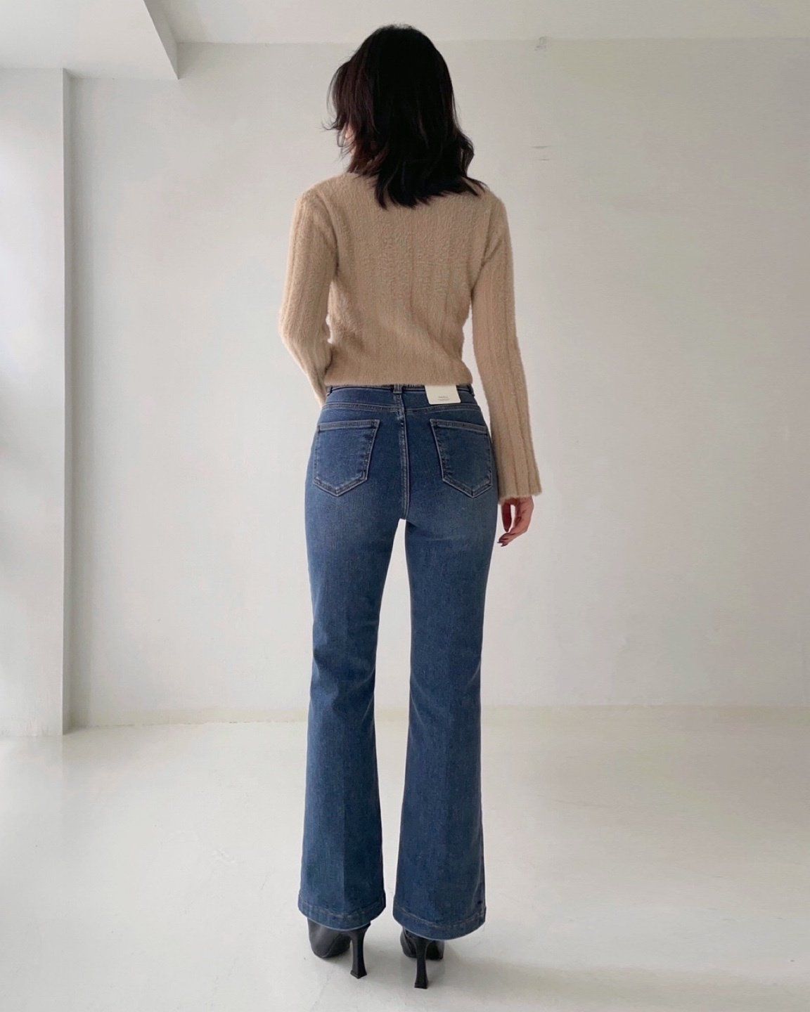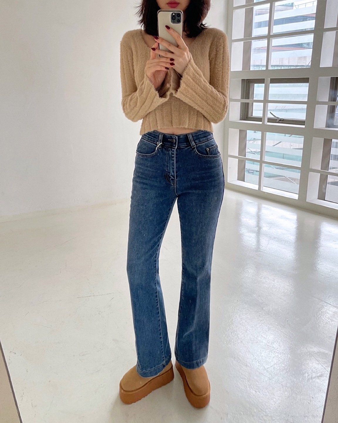 韓國女裝連線 - (內磨毛)彈性腰保暖材質翹臀小喇叭褲-深藍