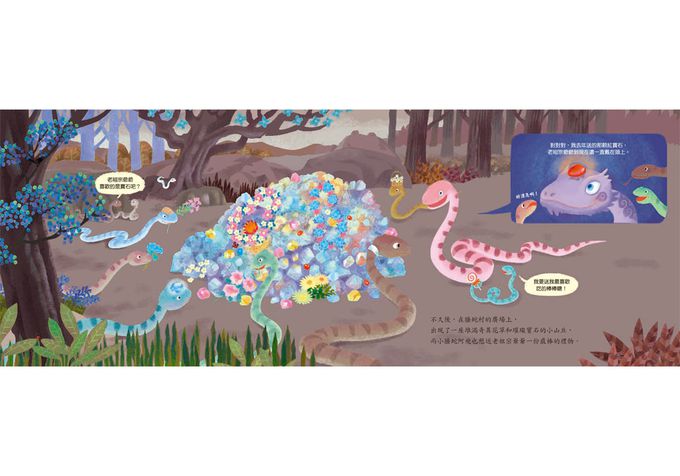 故事說,小螣蛇想和老祖宗爺爺一樣飛上天。畫裡老螣蛇的形象,精神飽滿,非常像是噴火龍,相較之下,小螣蛇就非常普通,不過就是顏色各異的小蛇巴黎,這樣的形象,也能是神獸?想飛的小螣蛇,在這個過程,他們拋棄了許多世俗所認為「珍貴」的事物——寶石,以之換取製作飛行器的材料。小螣蛇的行為,非常像我們身邊的孩子,持著對飛行的夢想、實踐各種想像力去實作,跌跌撞撞地,最後也真能飛起來。民俗符號,最難講述的地方,在於它們飽含太多隱喻,如何成為兒童自己的故事與力量,實在需要花腦筋。小螣蛇不是龍,但靠自己的力量飛起來,龍都忍不住回頭一望!