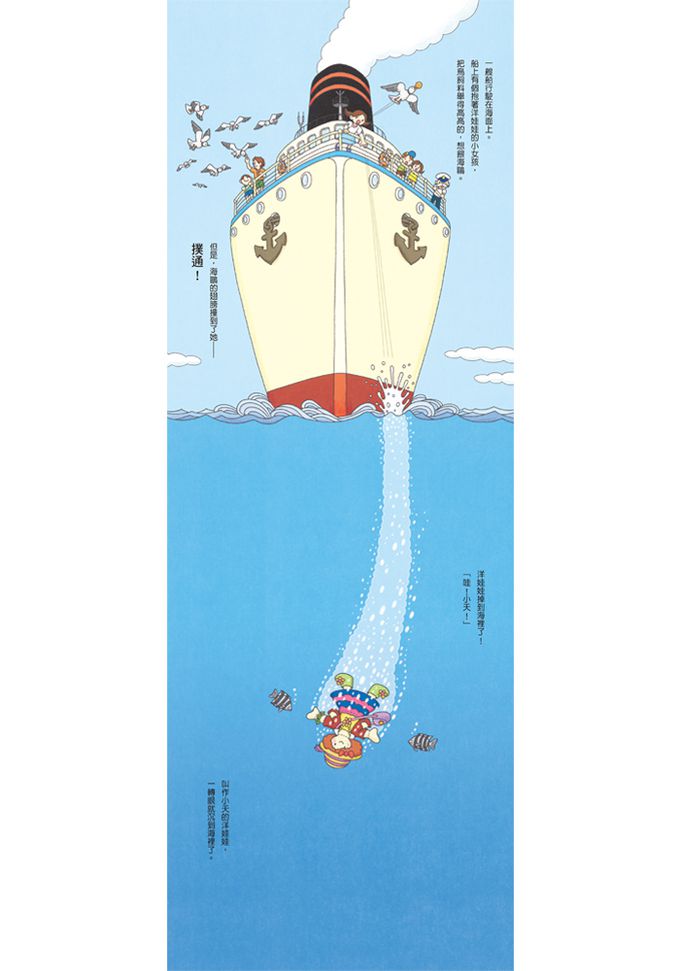 船上有個小女孩抱著洋娃娃小天在餵海鷗,一不小心,小天掉進了海裡!她身上的帽子、包包、衣服、頭髮……全都不知掉到哪兒去了。小天被吸入一陣奇妙的泡泡中,進入了神祕的海底建築裡探險……她會遇到哪些海洋生物?她能找回失落的東西嗎?她最後能回到小女孩的身邊嗎?
