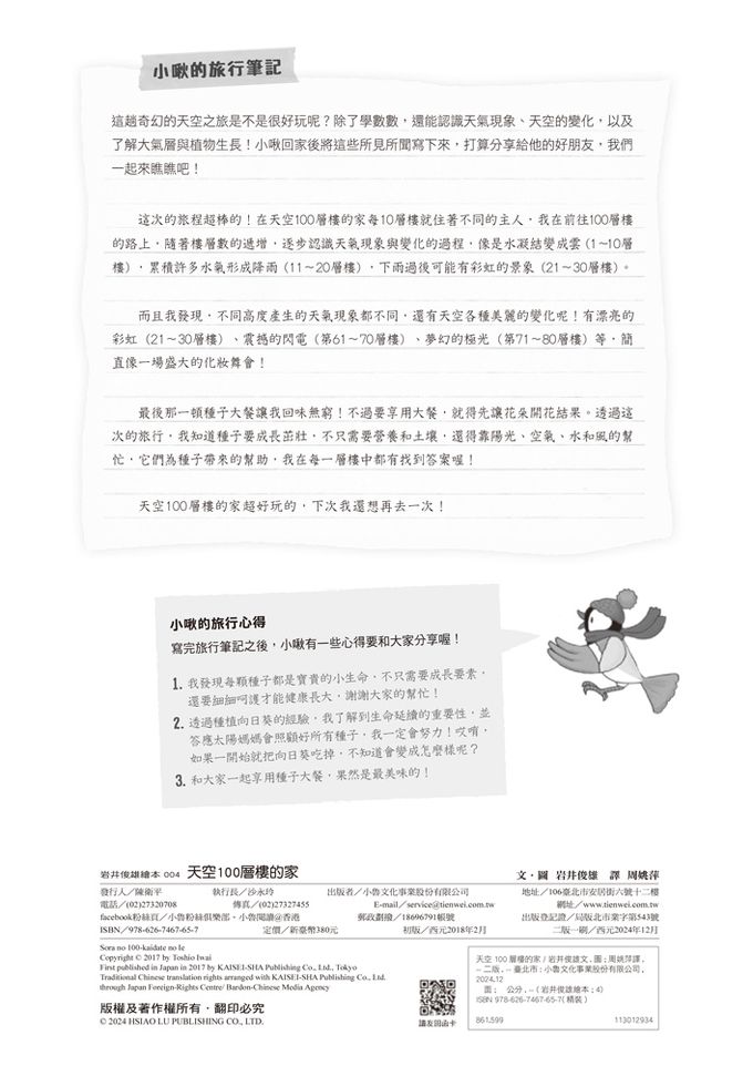 這趟奇幻的天空之旅是不是很好玩呢?除了學數數,還能認識天氣現象、天空的變化,以及了解大氣層與植物生長!小啾回家後將這些所見所聞寫下來,打算分享給他的好朋友,我們一起來瞧瞧吧!