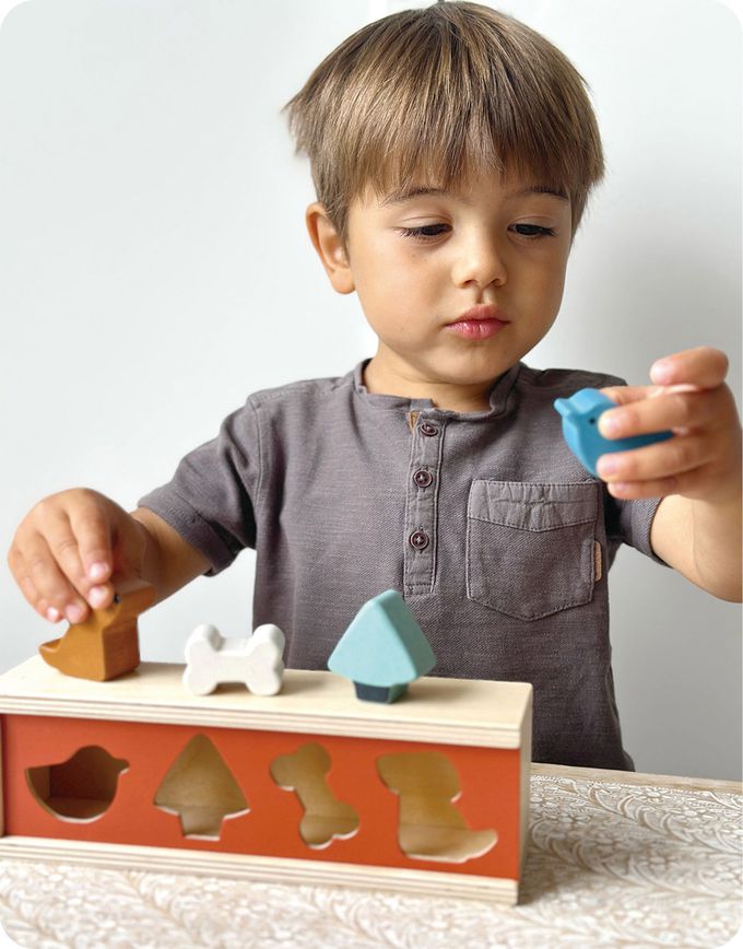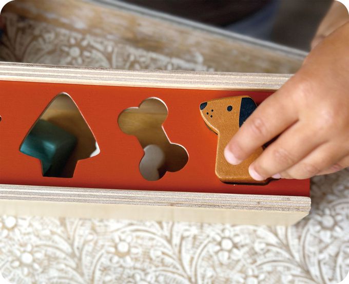 形狀配對盒,內含4個造型可愛的積木,分別是小鳥、樹、小狗和1根骨頭,可對應蓋子上的洞口進行配對遊戲,訓練手眼協調能力。