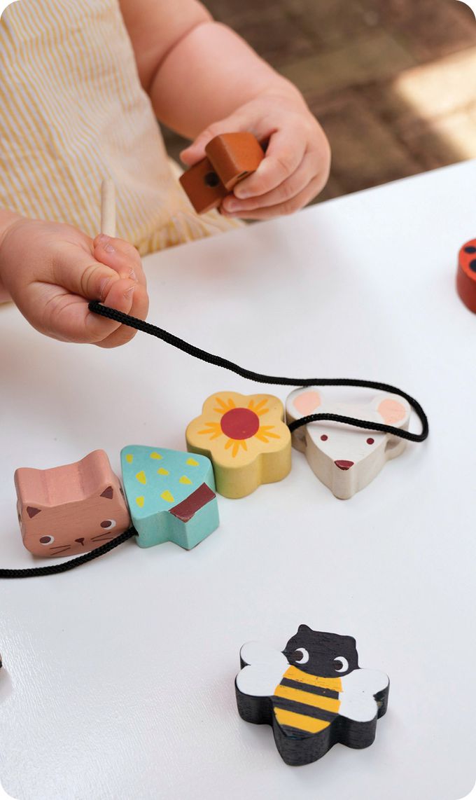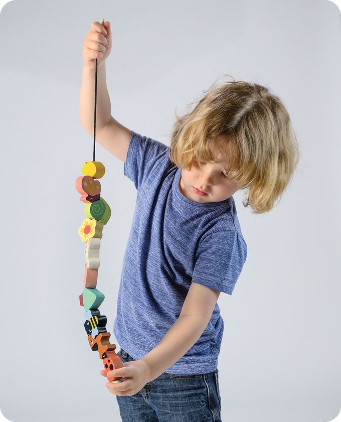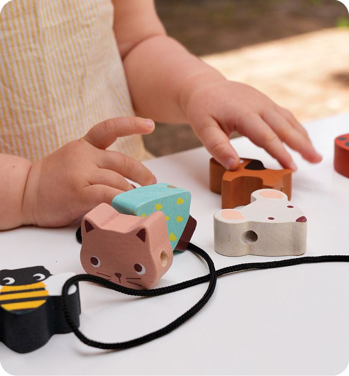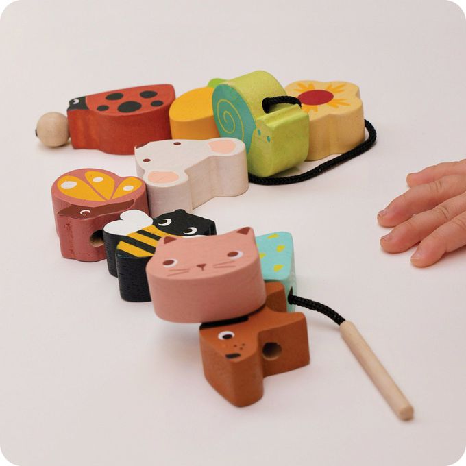 花園主題的木製造形串珠,內含一條黑線串聯,末端有木銷釘方便穿線。共有10顆造型木製串珠:瓢蟲、小狗、蜜蜂、樹木、小貓、老鼠、紅蘿蔔、花朵、蝸牛和蝴蝶。插圖使用鮮豔的色彩並搭配可愛的細節處理,吸引孩子的目光。