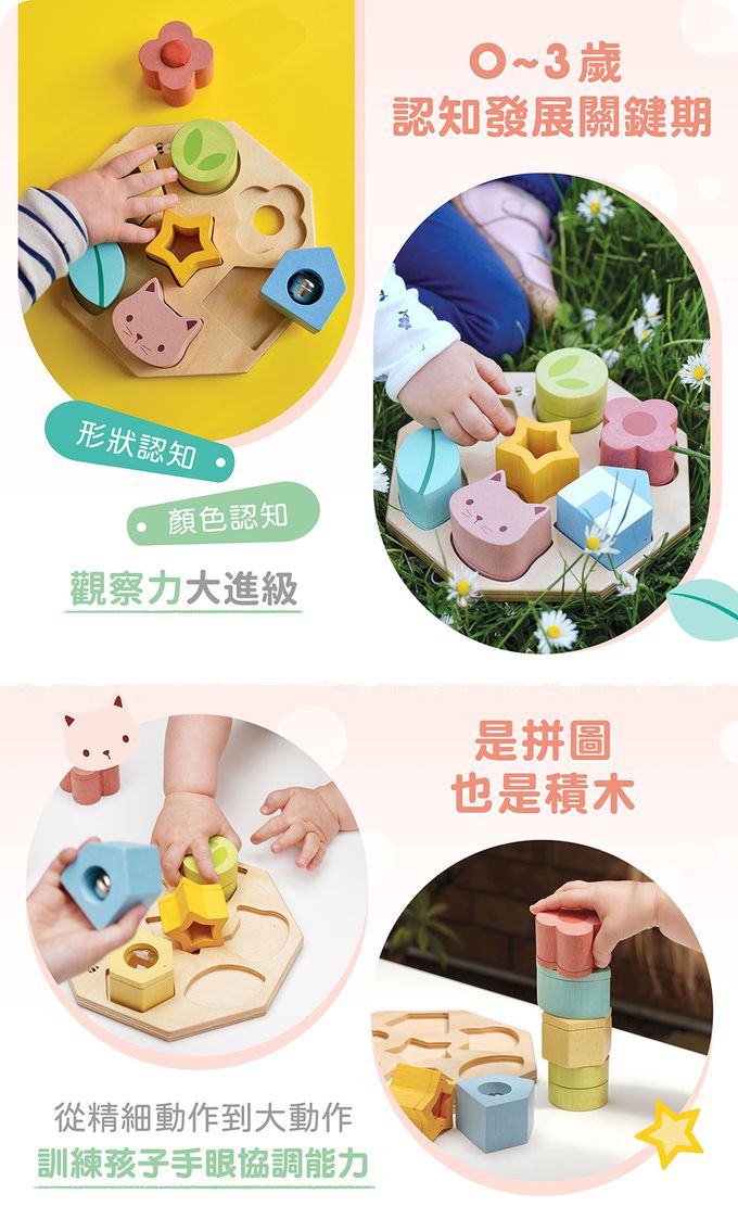 觸覺:貓咪形狀的積木可撫摸背面的觸感、按花背面的小球可以獲得感官的滿足。