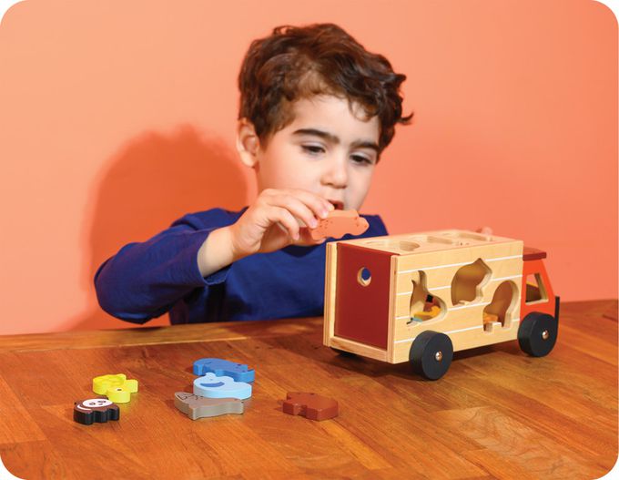 遊獵車的形狀配對遊戲,吸引孩子目光。遊獵車三面各有3個形狀洞口,讓孩子放進相對應的野生動物。內含9個野生動物積木:長頸鹿、海豹、熊、河馬、貓熊、鱷魚、大象、犀牛和獅子,讓孩子進行配對遊戲,訓練孩子的手眼協調能力。