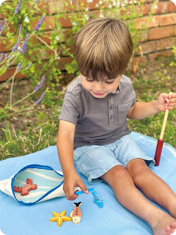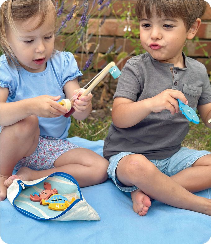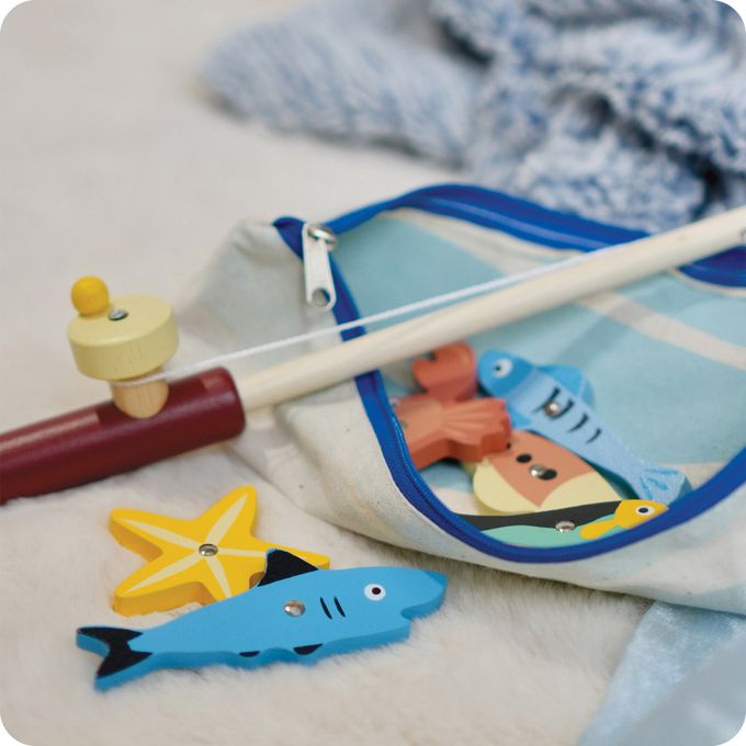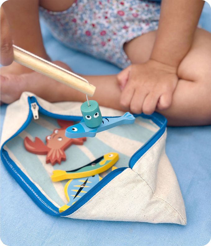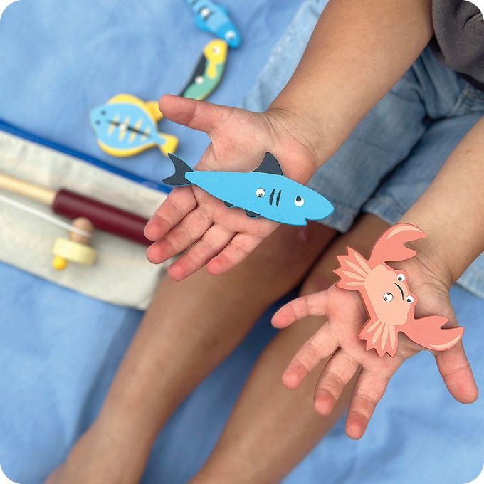 這組釣魚玩具內含一支磁性釣竿及7種海洋生物,全部裝在鉛筆袋裡面,打開內裡印有藍色波浪。7種動物分別是:海星、螃蟹、鯊魚、比目魚、鯡魚、鱈魚和鯖魚,每隻海洋生物的背面都印有數字,讓孩子邊玩邊學習數字和認識海洋生物。