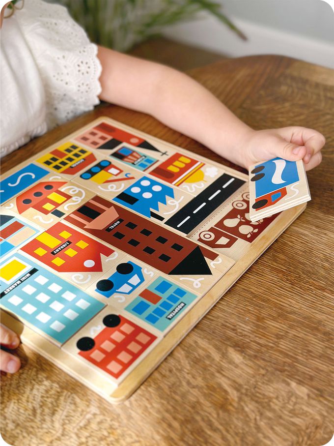 經典的城鎮認知拼圖,內含17塊形狀拼圖,每塊拼圖拿掉可看到與城鎮相對應的職業,增加孩子對各行各業的認知。