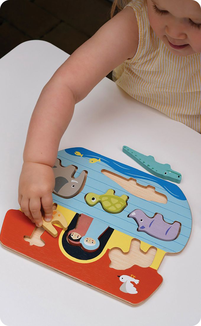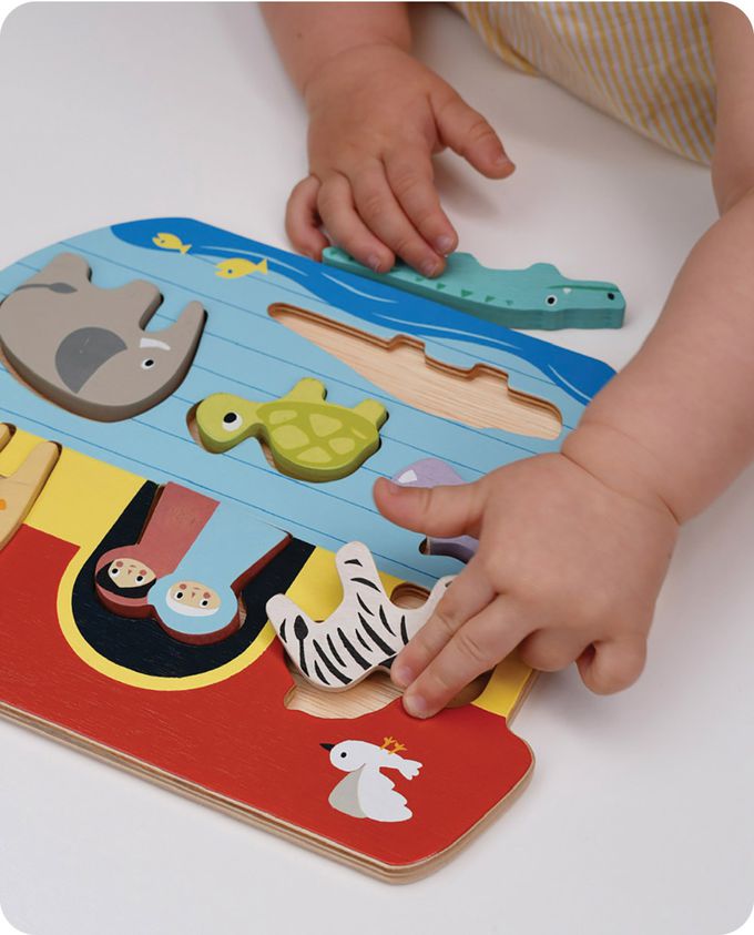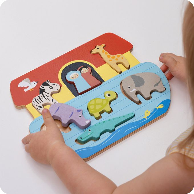 色彩繽紛的諾亞方舟益智拼圖,內含6種動物:斑馬、長頸鹿、犀牛、烏龜、大象和鱷魚,還有諾亞夫婦,吸引小孩進行配對遊戲,增加孩子對形狀及顏色的認知和認識動物。