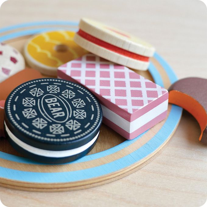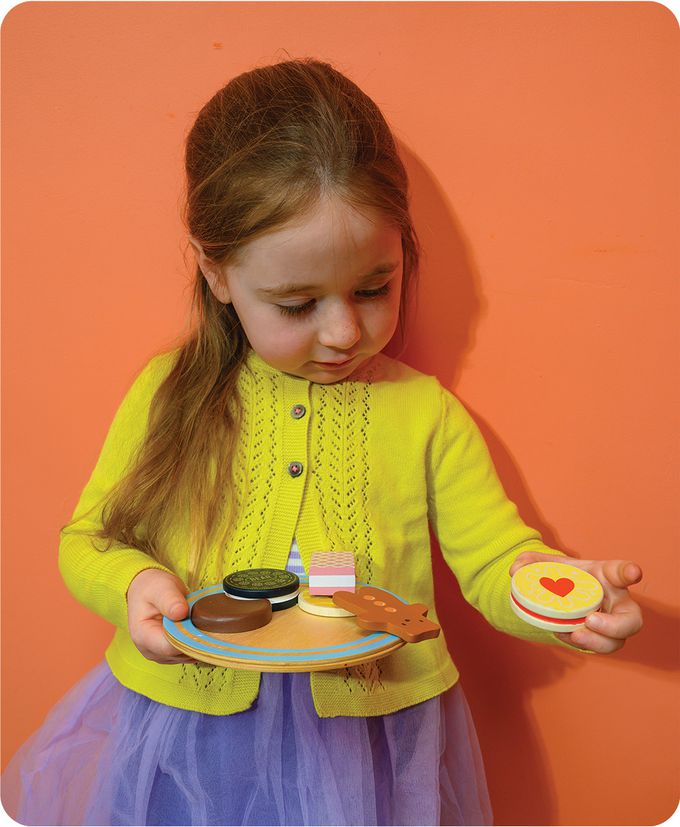 傳統的英式下午茶組,內含7塊餅乾:薑餅熊、威化餅、巧克力餅乾、果醬餅乾等,通通放在餅乾盤上。讓孩子透過家家酒遊戲,盡情發揮想像力和創造力。