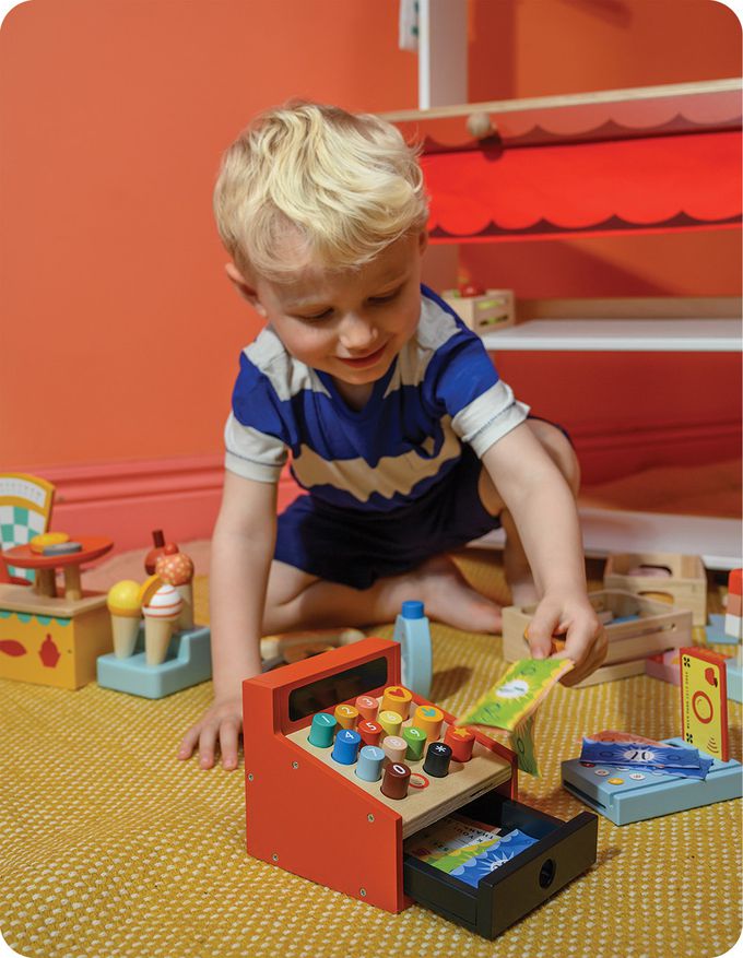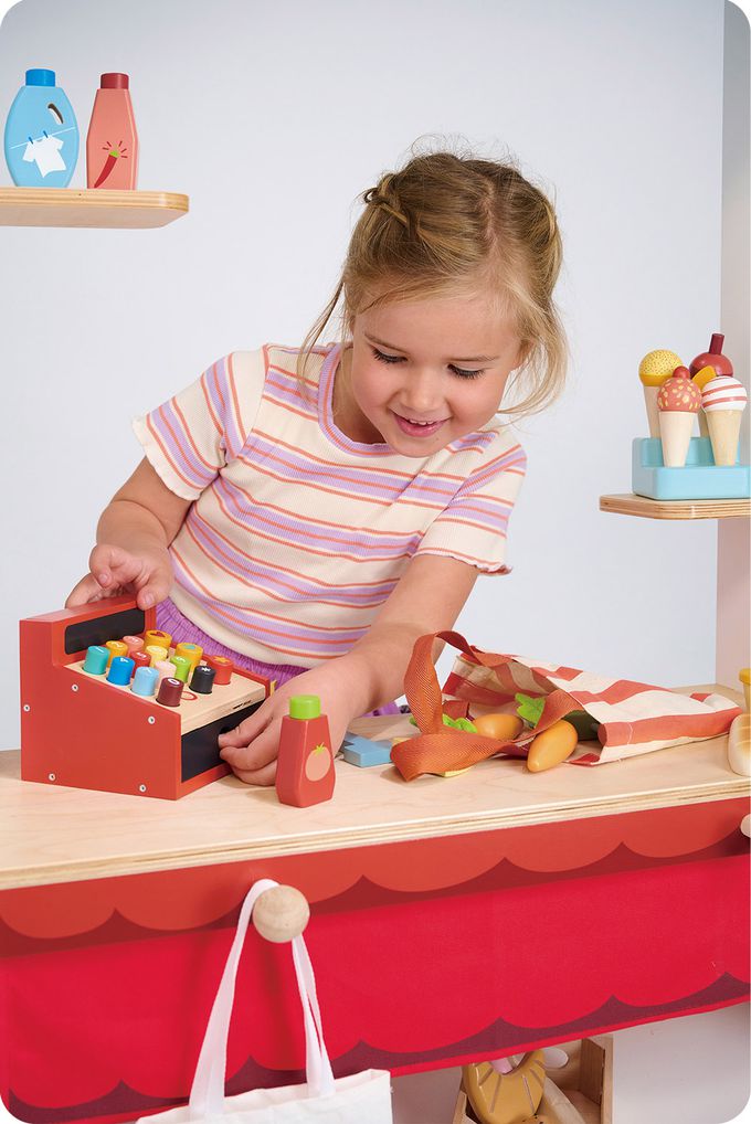 紅色的收銀機,搭配繽紛的數字按鈕和可吸附在收銀機的條碼掃描器。孩子在角色扮演的時候,使用收銀機裡面的硬幣和紙鈔跟客人結帳,模擬交易的行為,並增加對數字和金錢的認知。
