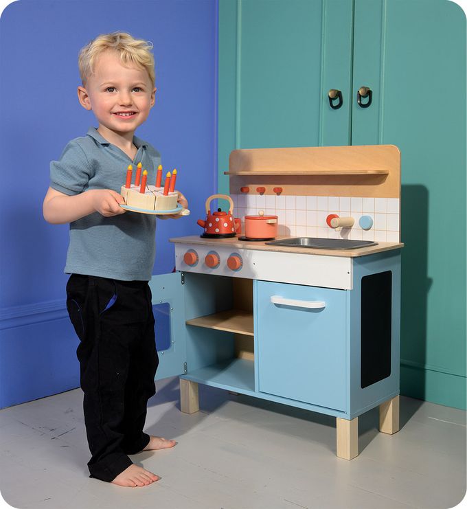 蔚藍海岸風的經典廚房,設備包含2個電磁爐、兩層的烤箱、收納櫃、餐具架、3個掛勾、3個溫控開關、水槽和水龍頭。另還有波卡圓點水壺、2個杯子、砂鍋、湯匙及鍋鏟和小方格毛巾。開放式的遊戲,讓孩子透過家家酒遊戲,盡情發揮想像力和創造力,並發展社交和語言能力。