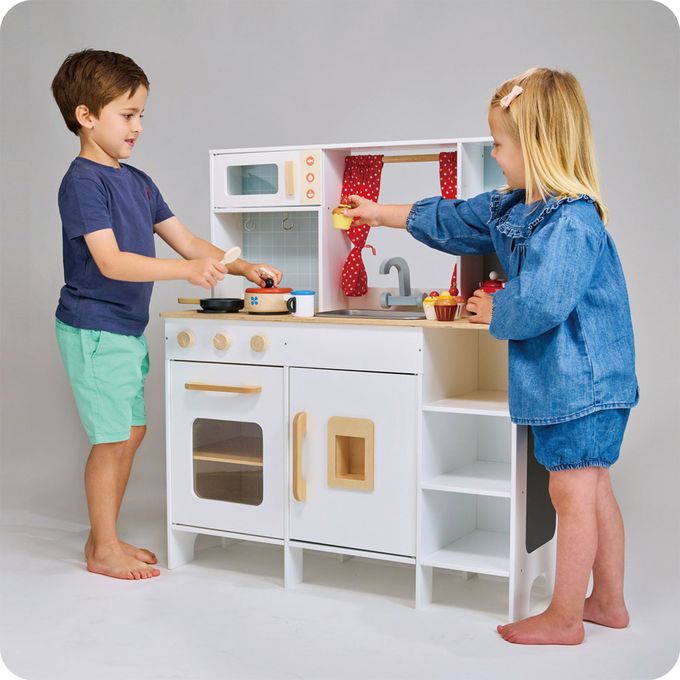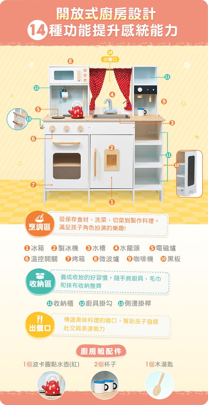 豪華多功能廚房組,讓小小廚師忙進忙出,透過窗戶傳遞美味食物。廚房設備包含3個電磁爐、2層烤箱、冰箱和製冰機、4個收納櫃、廚房掛勾及側邊掛桿、3個溫控開關、水槽和水龍頭、微波爐、咖啡機和黑板。另還有波卡圓點水壺(紅)、2個杯子及木湯匙。開放式廚房設計,14種功能提升感覺統合能力,讓孩子透過家家酒遊戲,盡情發揮想像力和創造力,並發展社交和語言能力。