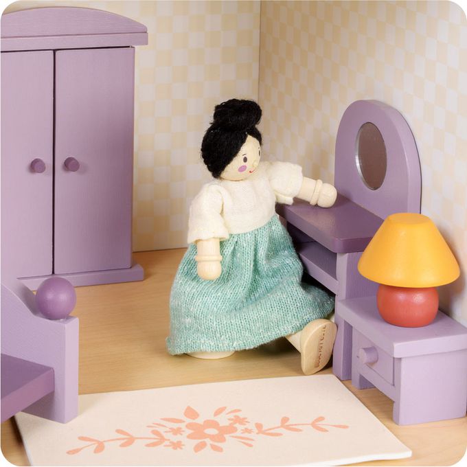 歐式典雅臥室配件有:雙人床、床頭燈和床頭櫃、梳妝台和凳子、衣櫃和印花地毯。透過娃娃屋的陳列擺設,融入生活情境,還可建構立體空間感、培養觀察力和提升美感素養。