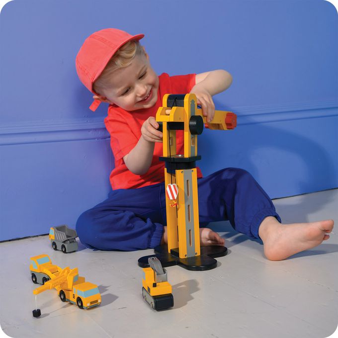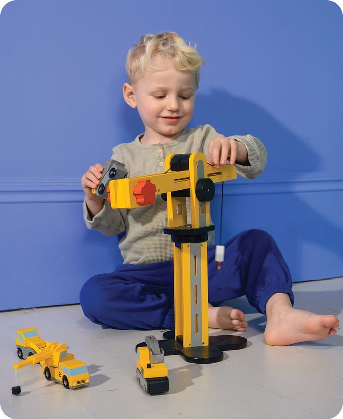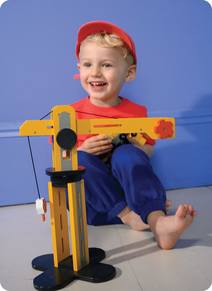 迴旋建築吊車組,有1個機械手臂,可前後移動,前端有一個掛勾可進行吊裝作業,下方有一個黑色轉盤可幫助手臂進行迴轉。轉動橘色齒輪可以進行吊裝作業,控制上下升降,鍛鍊小手的靈活度和手眼協調。孩子在操作的過程還能熟悉起重機的用途和重要性,加深對各行各業的理解與尊敬。