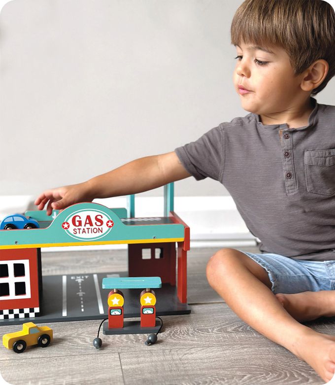 兩層樓的立體停車加油站,內附3台汽車、2個加油機、汽車升降梯、直升機停機坪。另也有汽車專用坡道,可直接行駛至二樓汽車專用停車位。開放式的設計,搭配升降梯和坡道,建構孩子的空間概念和認識立體停車場的運作原理。