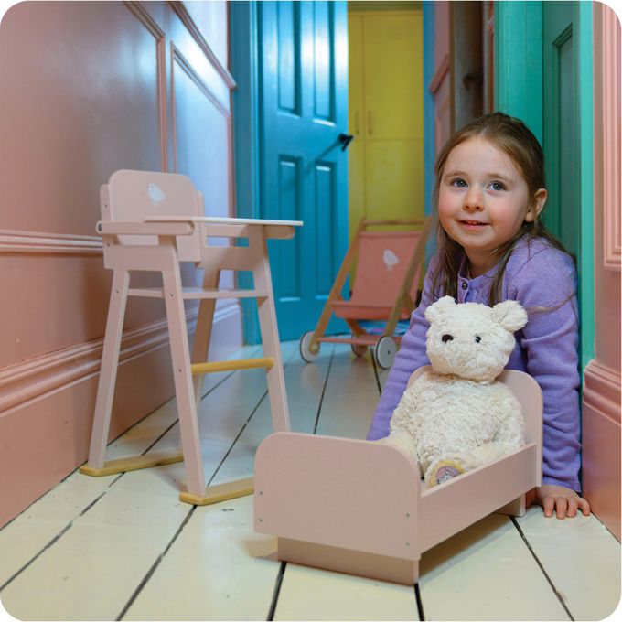 專為娃娃設計的貝比娃娃床。將娃娃或布偶放到床上,讓孩子學習陪伴和照顧,透過角色扮演,激發想像力和創造力,也培養照顧娃娃的責任感和友愛的態度。