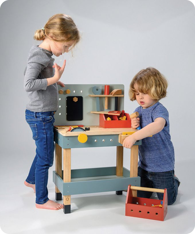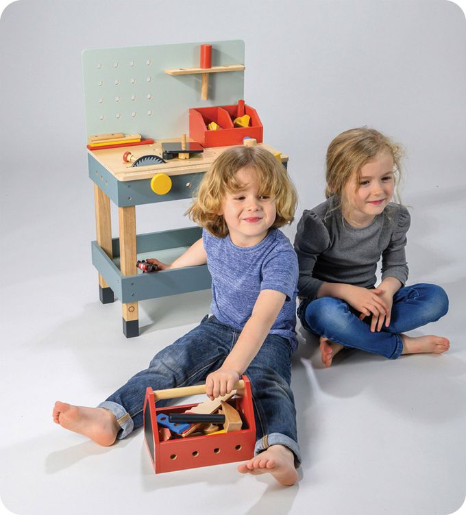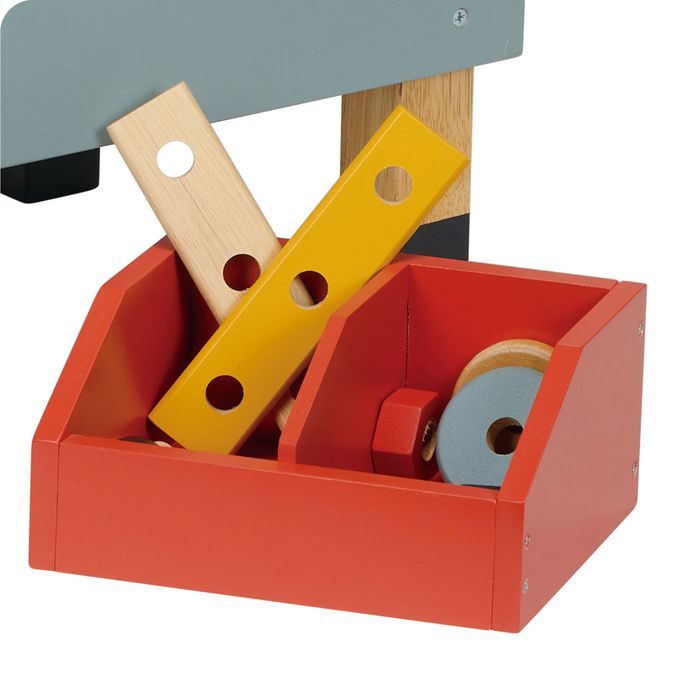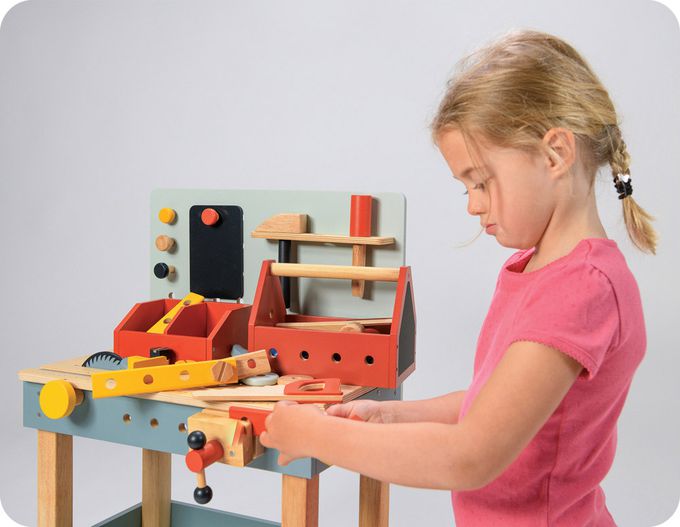 小小匠人維修中!工具台豐富的配件滿足孩子的想像力和創造力,工具包含鋸子、電鋸、鐵鎚、扳手、螺絲起子、組合板、黑板等。認識工具並學習使用操作,提升邏輯建構,訓練手眼協調及培養耐性和思考力。