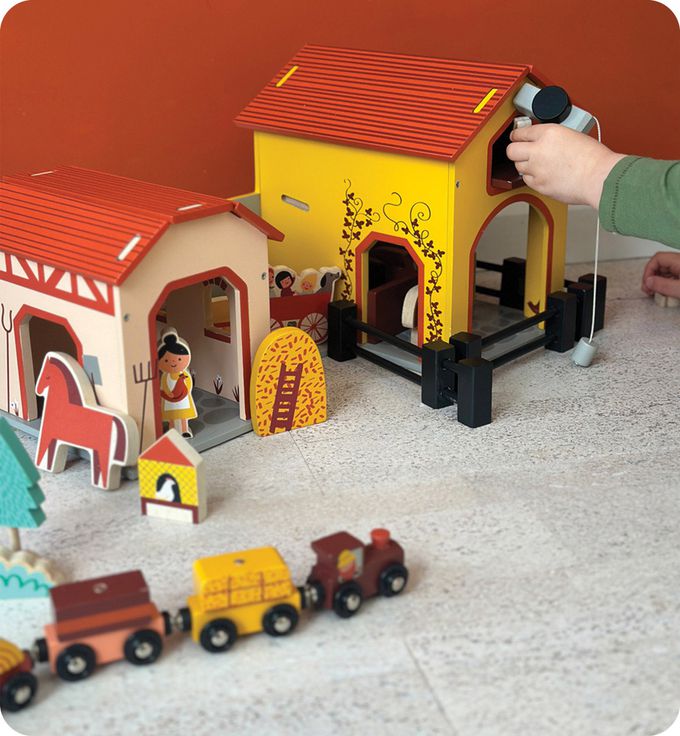 動物農莊有穀倉、馬廄、滑輪升降系統、擠乳棚、糧倉、4個柵欄、馬、羊、2隻豬和飼料槽、公雞、2隻母雞、2個乾草捆、一些小麥、農夫和他的妻子。讓孩子體會照顧動物的辛勞,教導孩子愛心與耐心,增加他們的同情心與責任感。