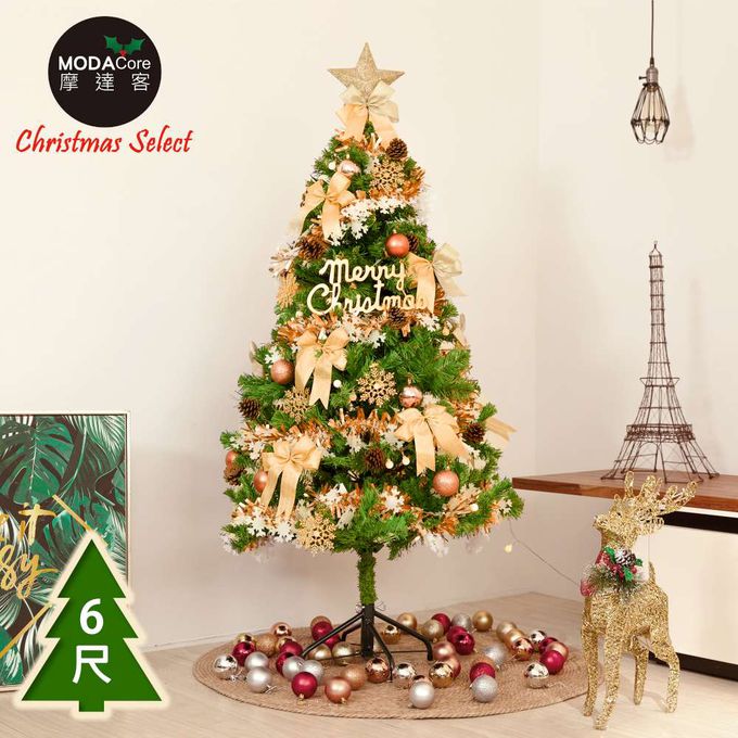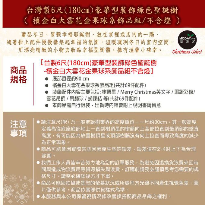 台灣製6尺(180cm)豪華型裝飾綠色聖誕樹/檳金白大雪花金果球系全套飾品組不含燈/本島免運費/歐美耶誕外銷人氣款