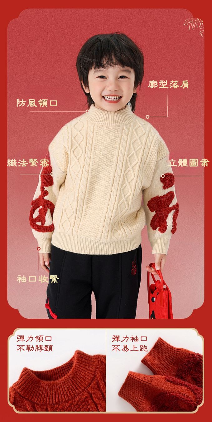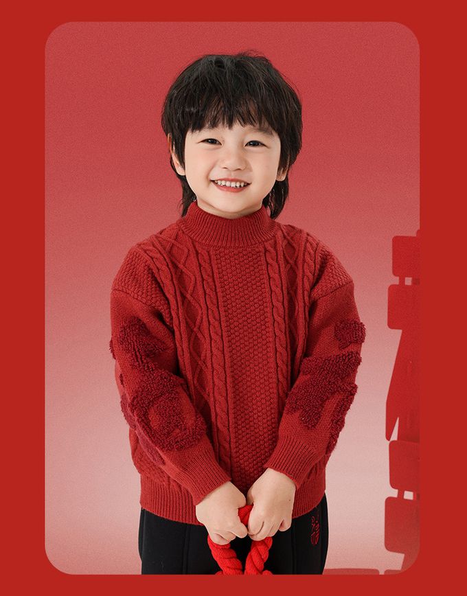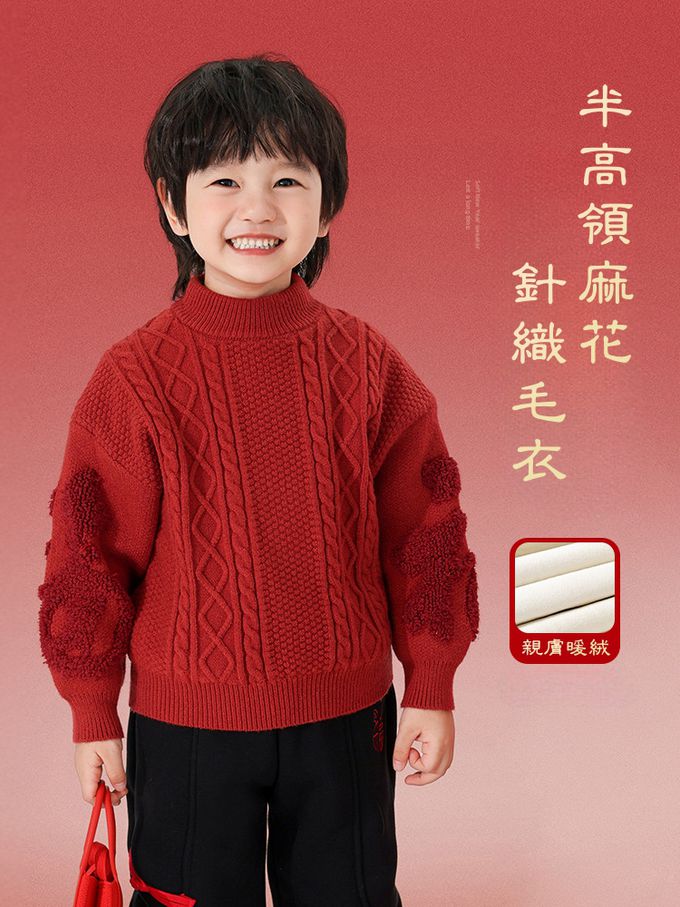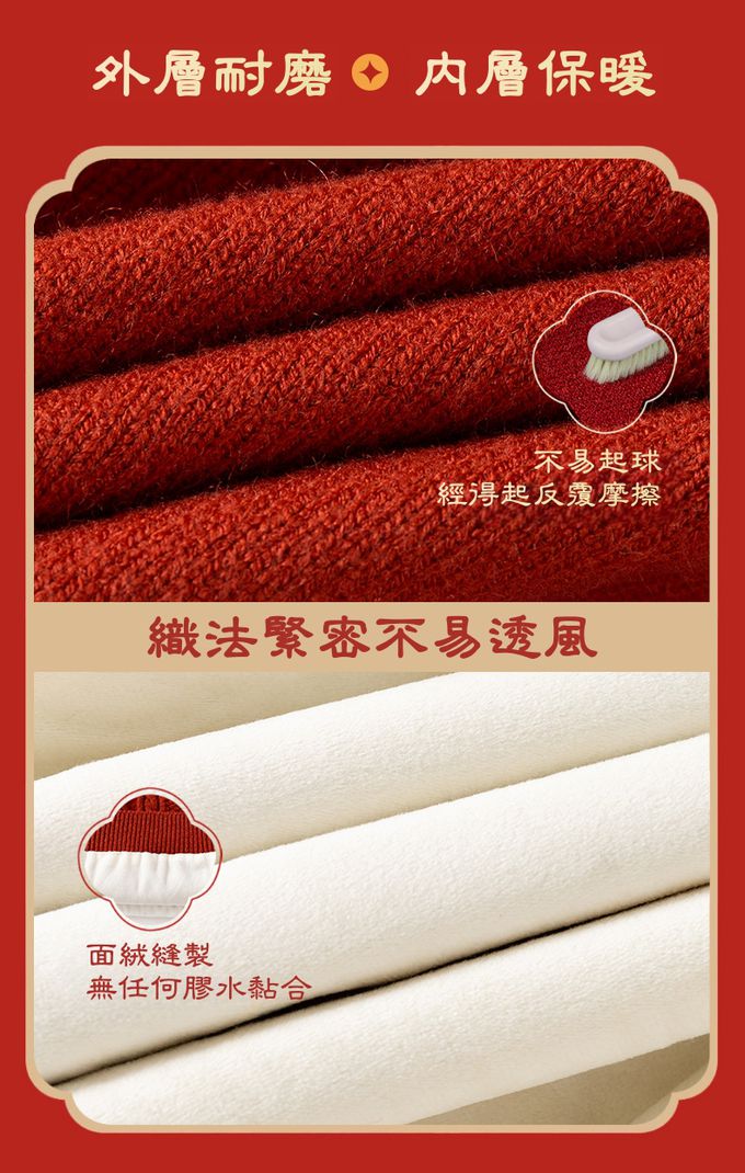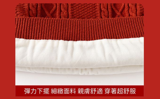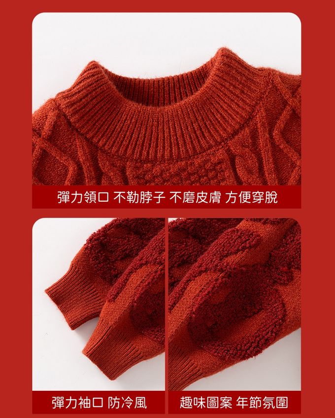 半高領麻花針織上衣/毛衣(加絨)-雙福臨門-紅色
