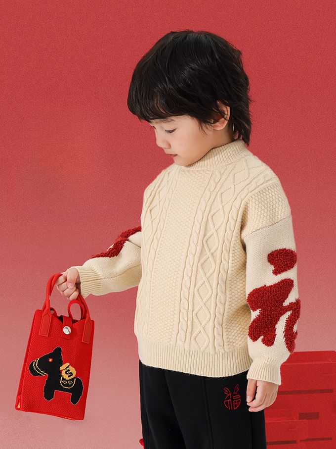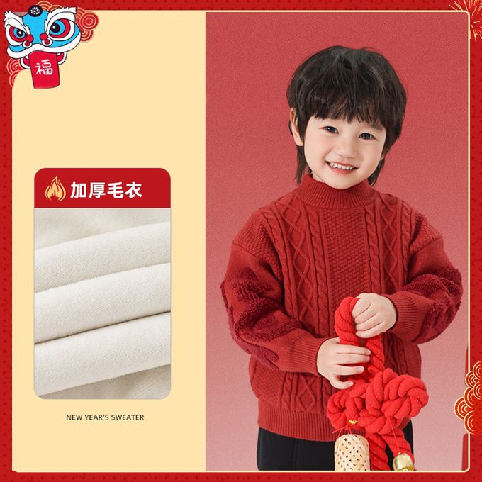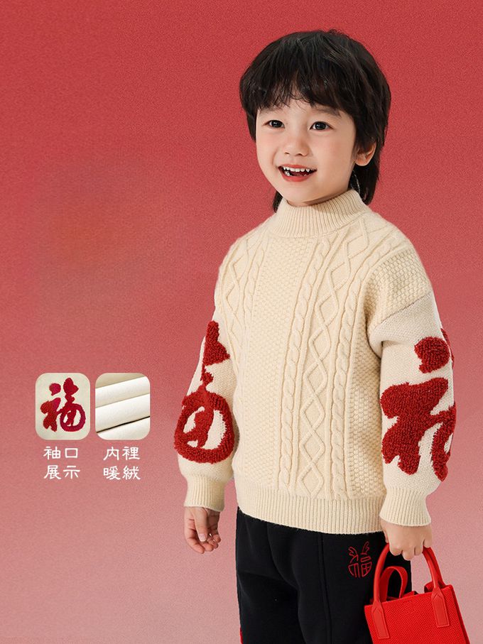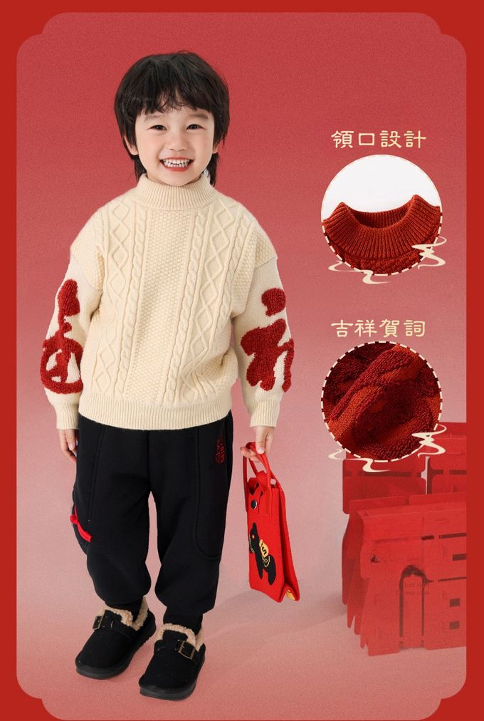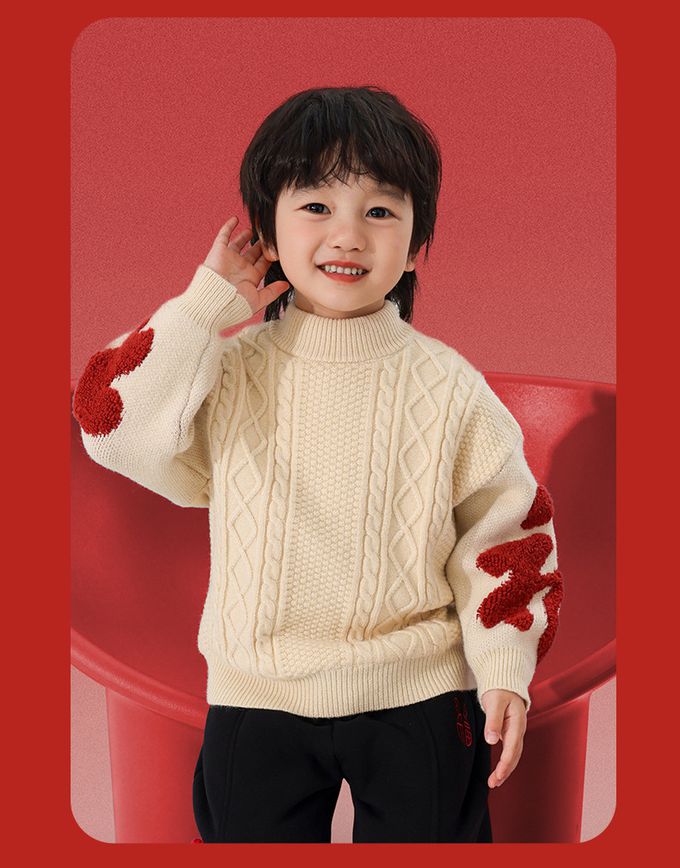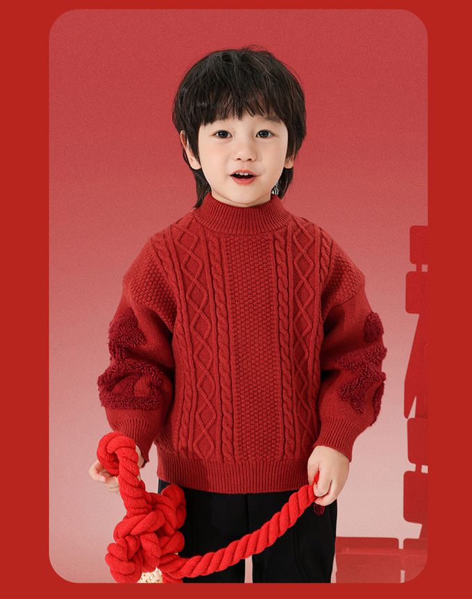半高領麻花針織上衣/毛衣(加絨)-雙福臨門-紅色