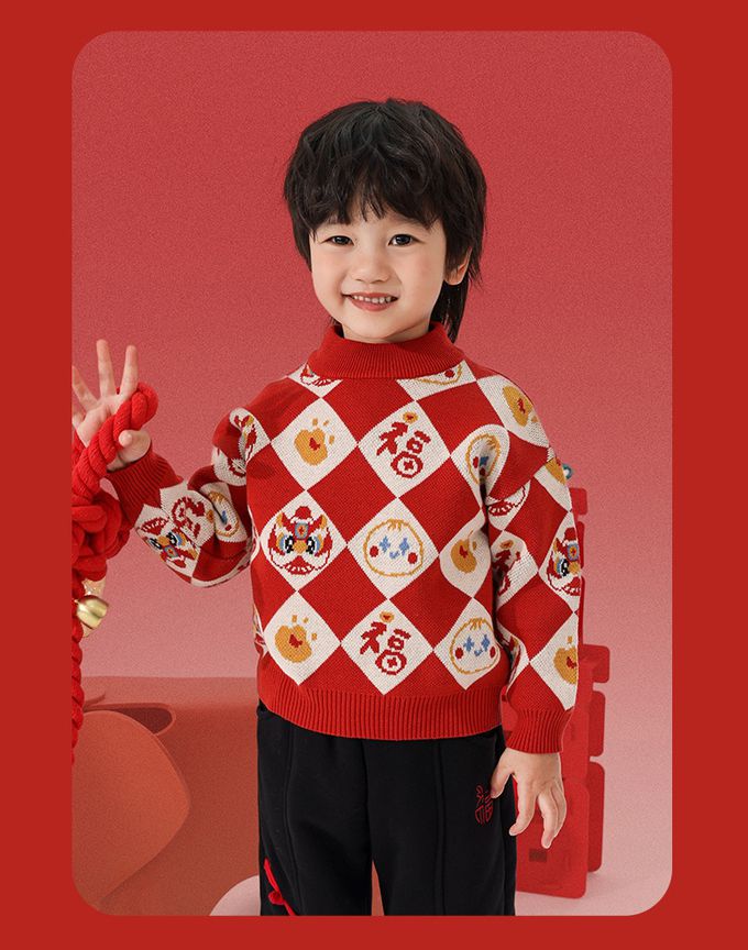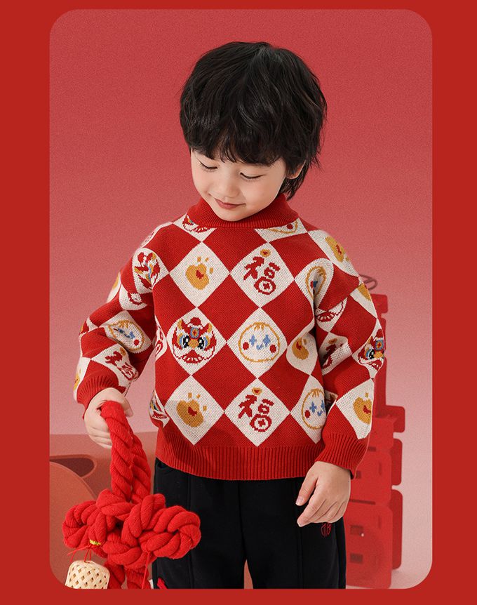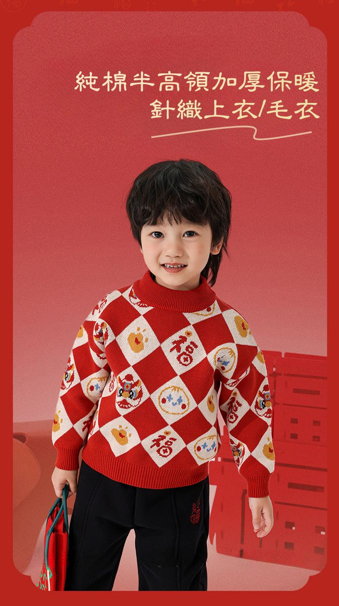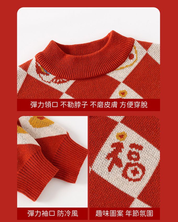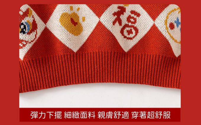 純棉半高領加厚保暖針織上衣/毛衣-金獅送福-紅色