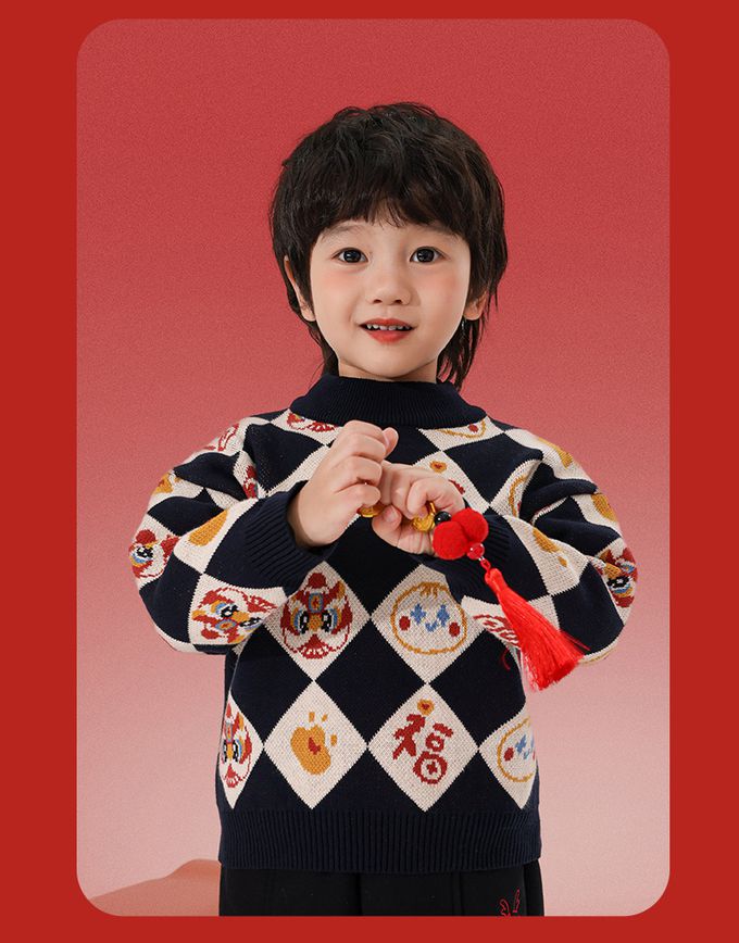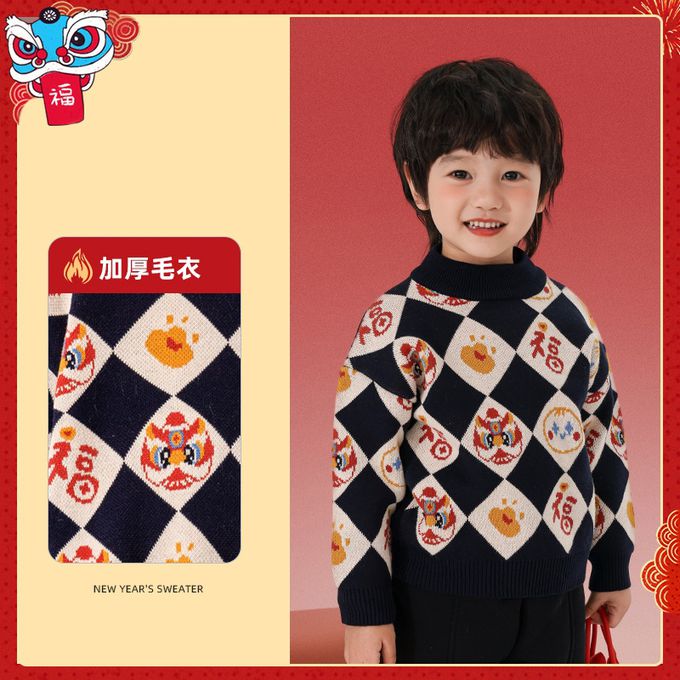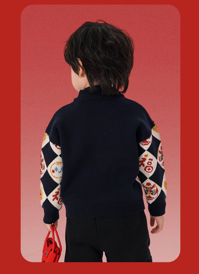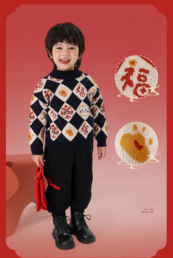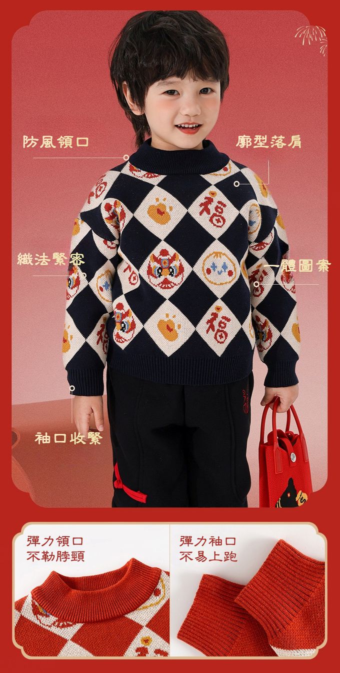 純棉半高領加厚保暖針織上衣/毛衣-金獅送福-紅色