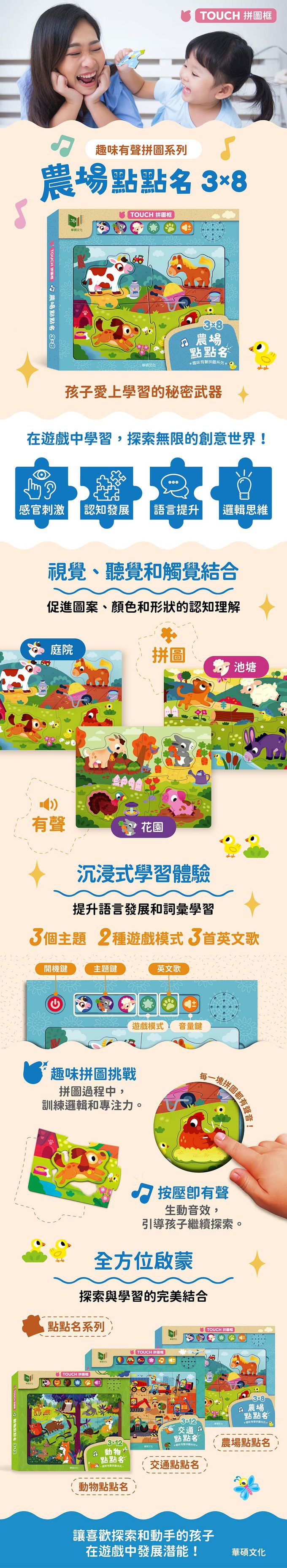 對應主題、按壓拼圖聽動物有趣的聲音,增添學習樂趣。