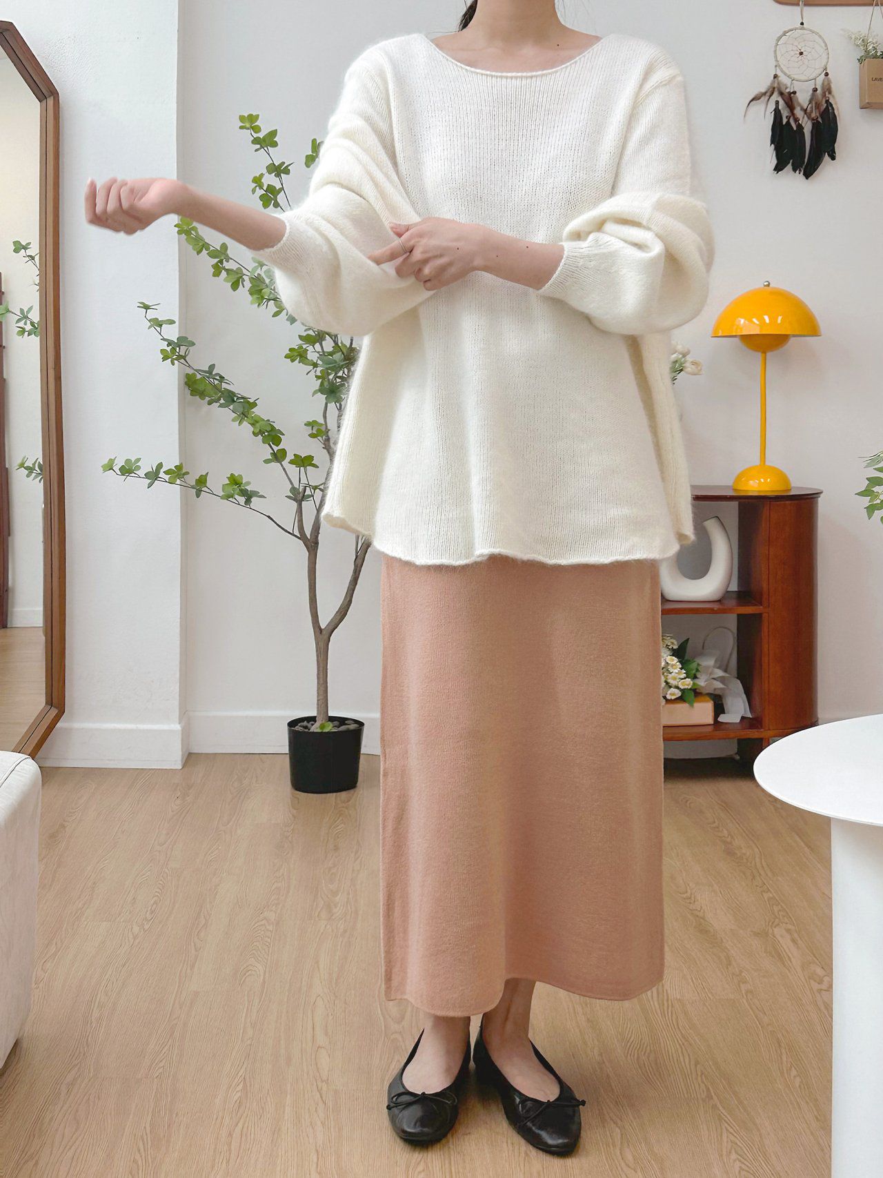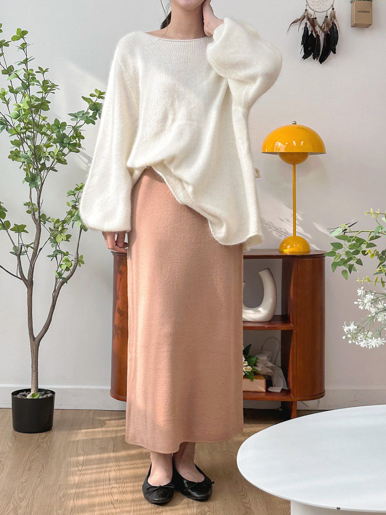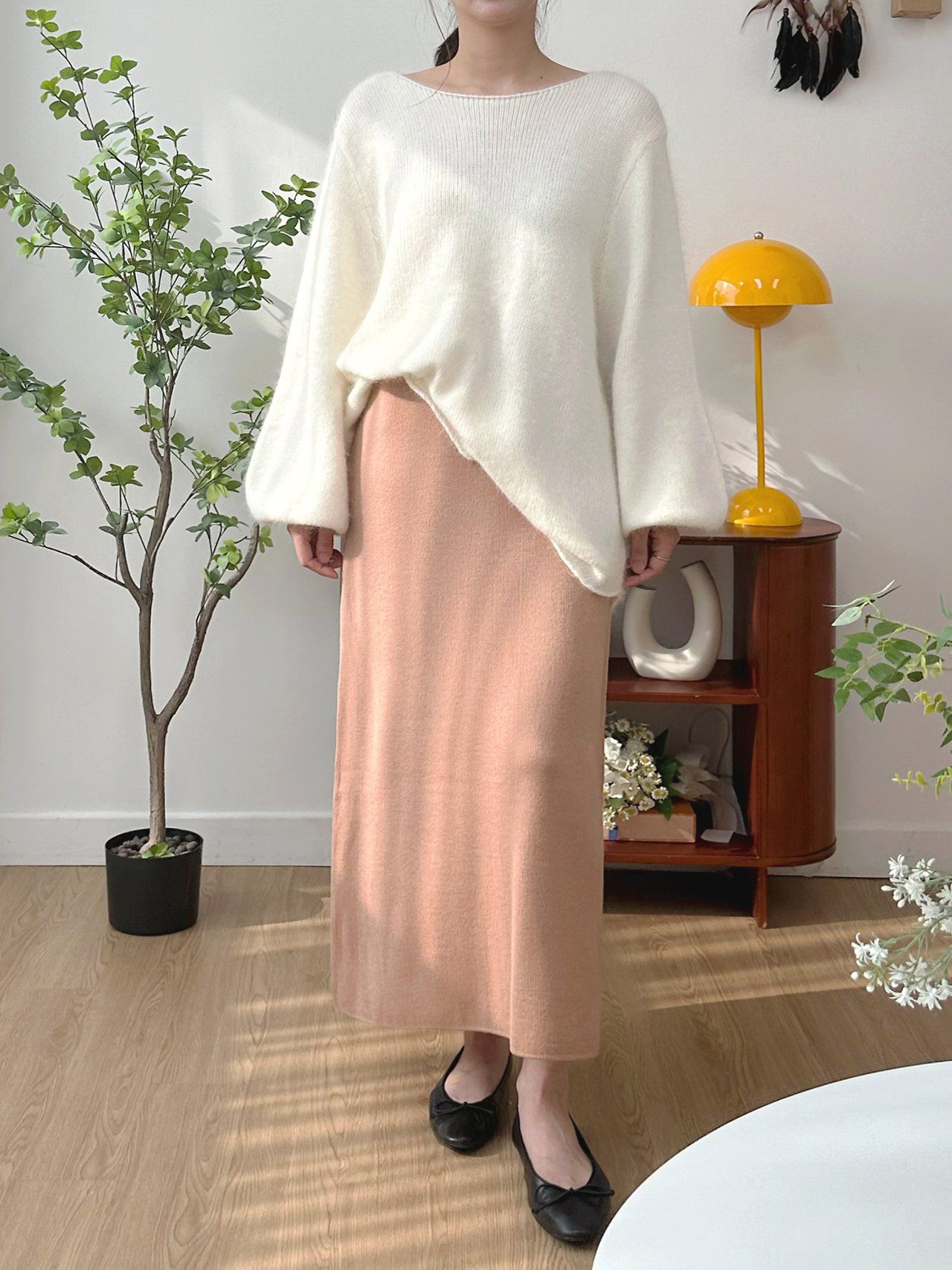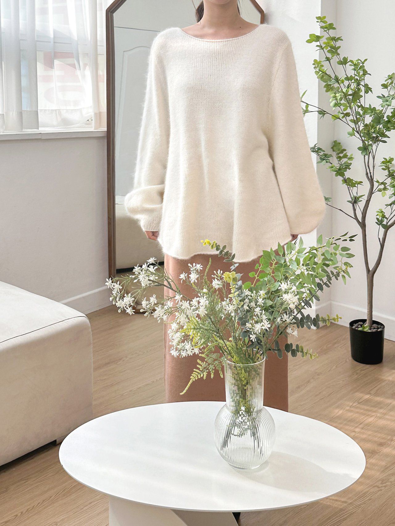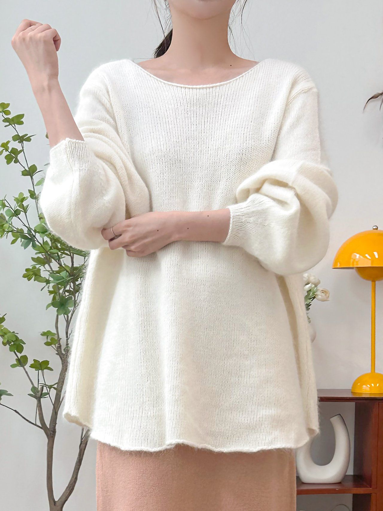 韓國女裝連線 - 慵懶混毛傘襬蓬蓬袖針織上衣-象牙白 (FREE)