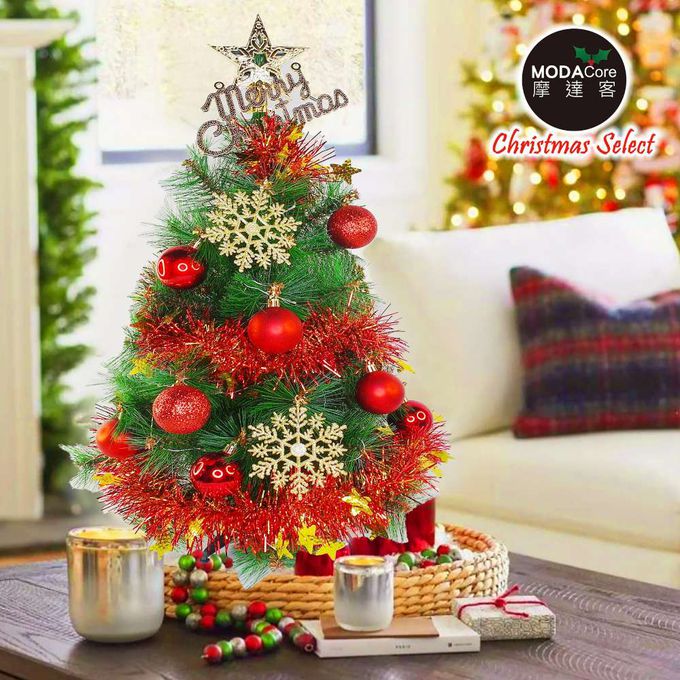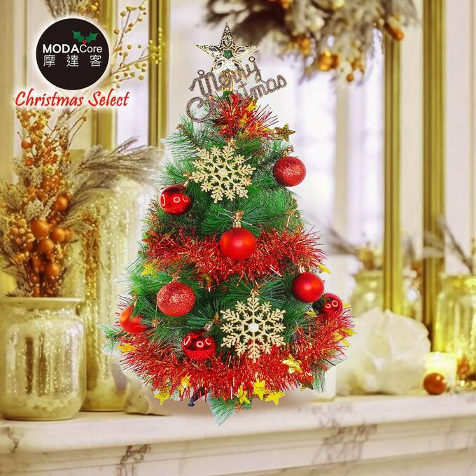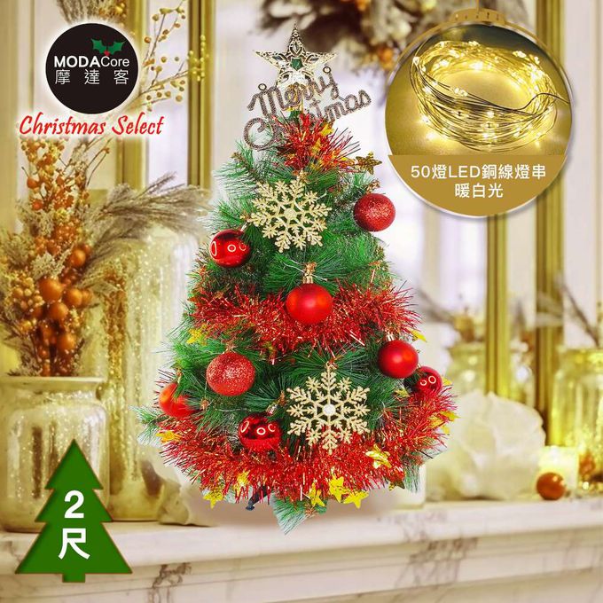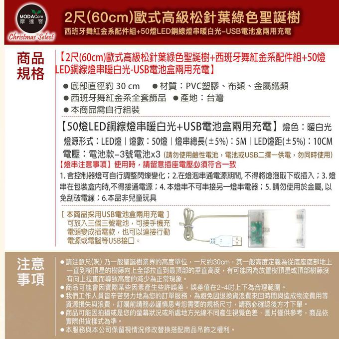 品名:台灣製2尺(60cm)歐式高級松針葉綠色聖誕樹+西班牙舞紅金系配件組+50燈LED銅線燈串暖白光-USB電池盒兩用充電/本島免運費MIT歐美外銷款